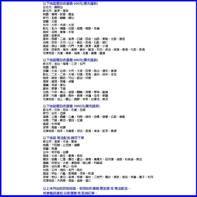 - 針對大型商品(包括:大型家電、家具床墊、健身按摩器材、車類...等),商店將於完成收款確認後,一天內〈不含例假日〉將會有專人與您確認相關配送細節等的聯繫。偏遠地區、樓層費及其它加價費用,皆由商店於約定配送時一併告知,商店將保留出貨與否的權利。