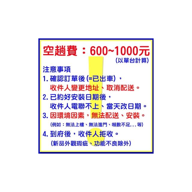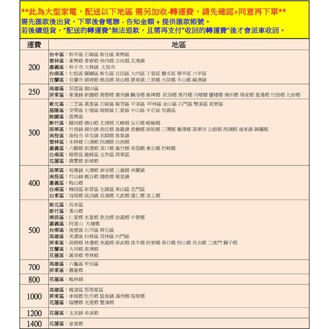 - 針對大型商品(包括:大型家電、家具床墊、健身按摩器材、車類...等),商店將於完成收款確認後,一天內〈不含例假日〉將會有專人與您確認相關配送細節等的聯繫。偏遠地區、樓層費及其它加價費用,皆由商店於約定配送時一併告知,商店將保留出貨與否的權利。