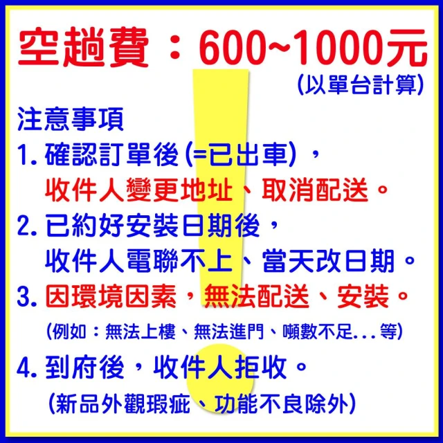 - 針對大型商品(包括:大型家電、家具床墊、健身按摩器材、車類...等),商店將於完成收款確認後,一天內〈不含例假日〉將會有專人與您確認相關配送細節等的聯繫。偏遠地區、樓層費及其它加價費用,皆由商店於約定配送時一併告知,商店將保留出貨與否的權利。
