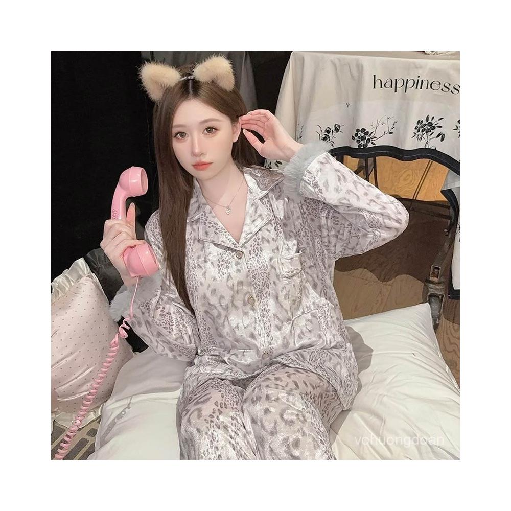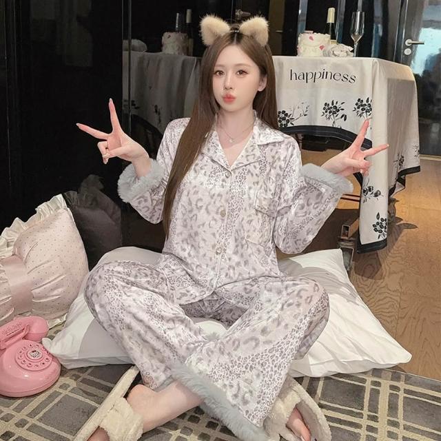 長袖金絲絨睡衣女豹紋KT卡通開衫印花金鑽絨套裝