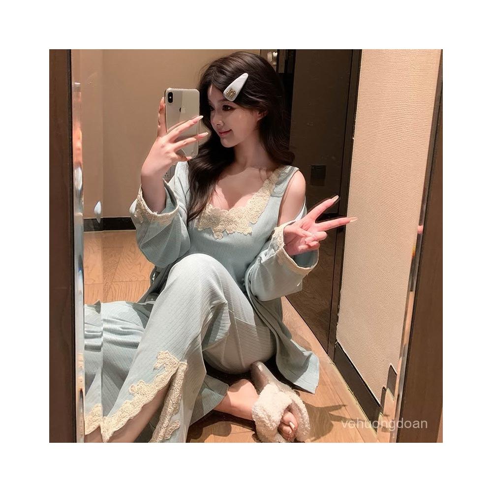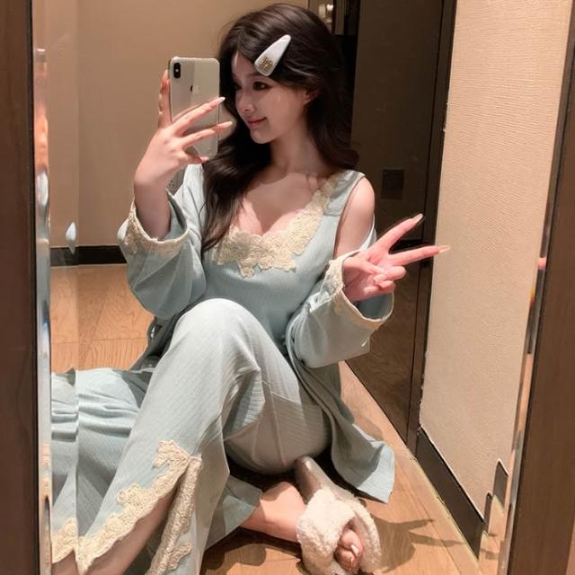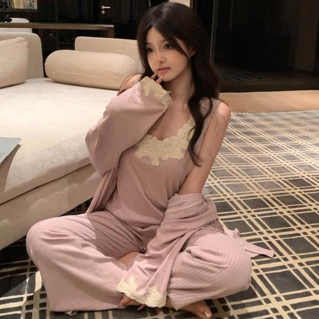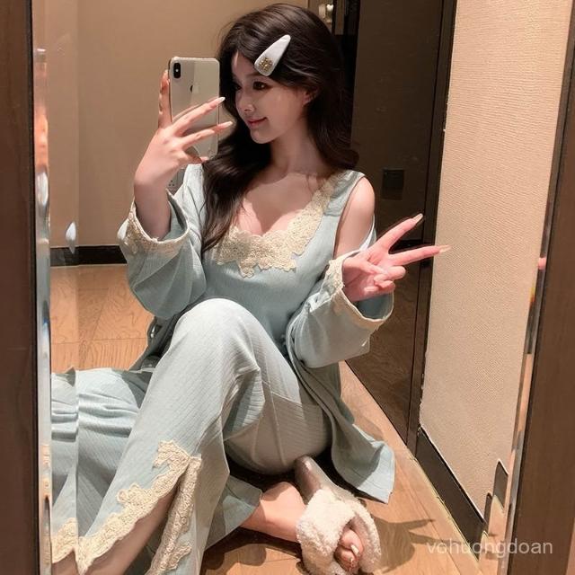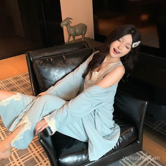 貴㛿級高奢羊絨睡衣女,秋冬季性感純慾長袖三件套蕾絲絨睡衣套裝