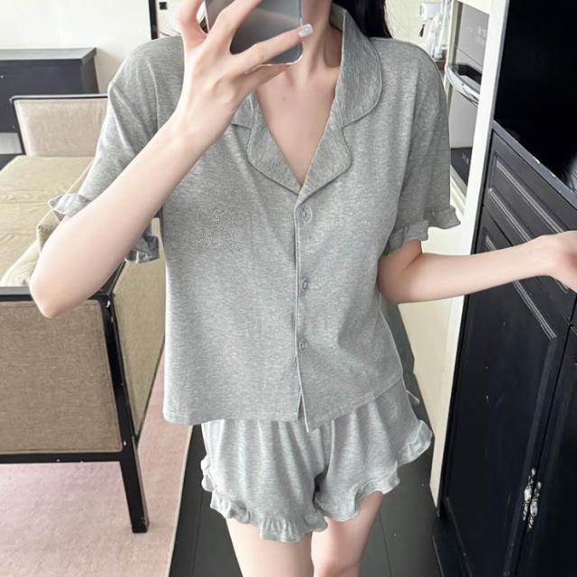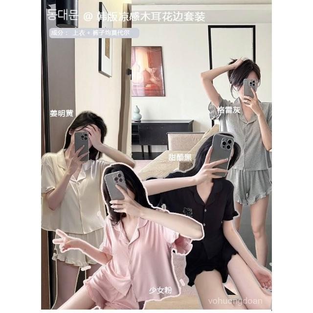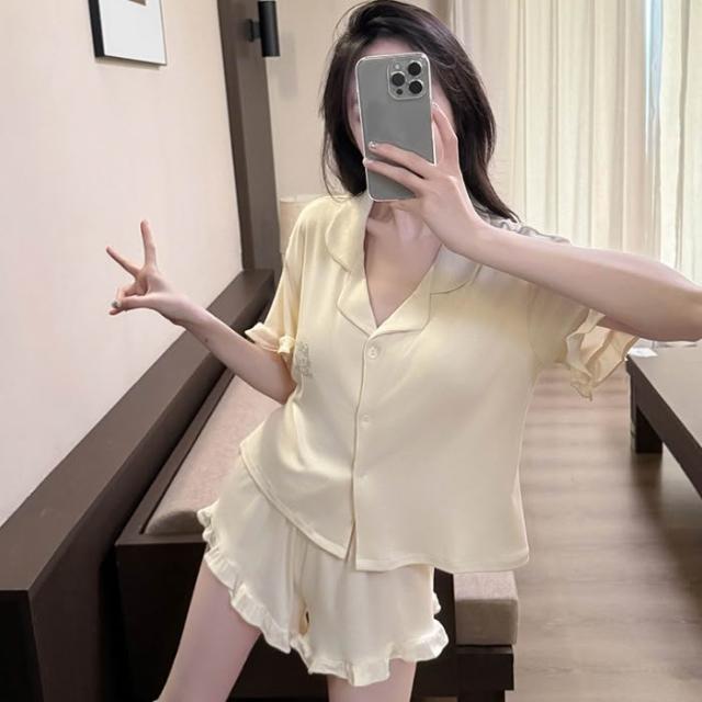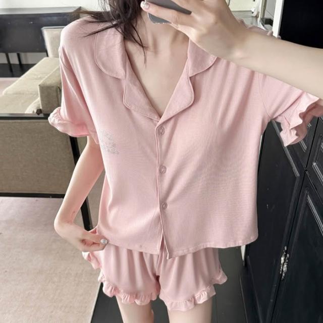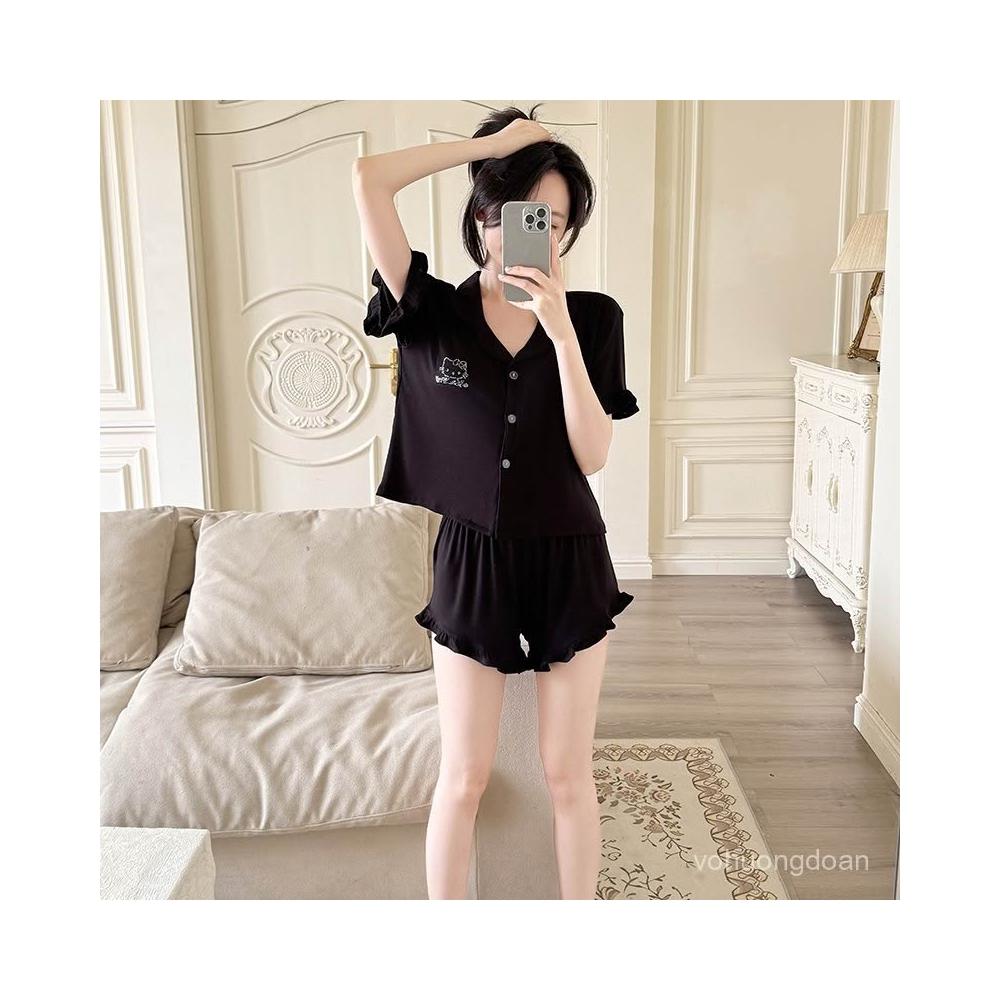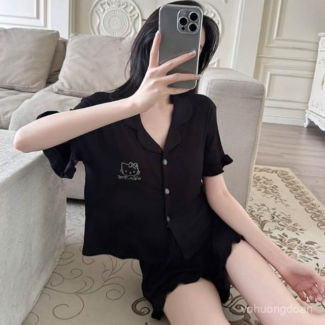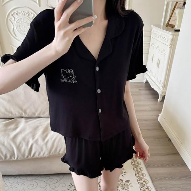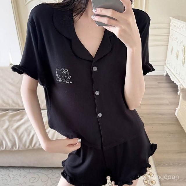 夏季翻領帶胸墊短袖短褲莫代爾睡衣女可愛燙鑽KT貓開衫套裝。