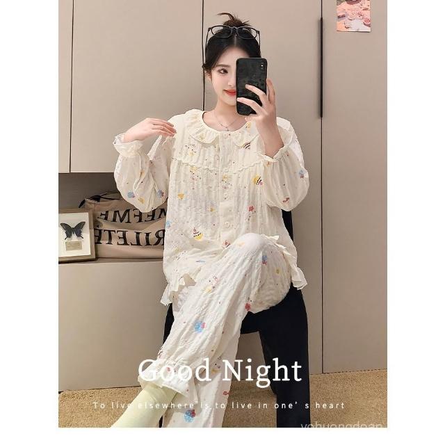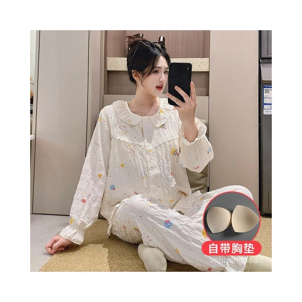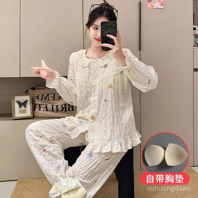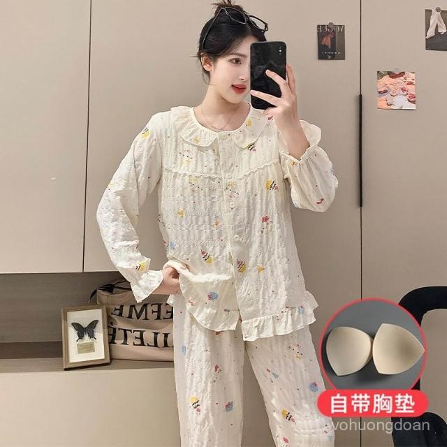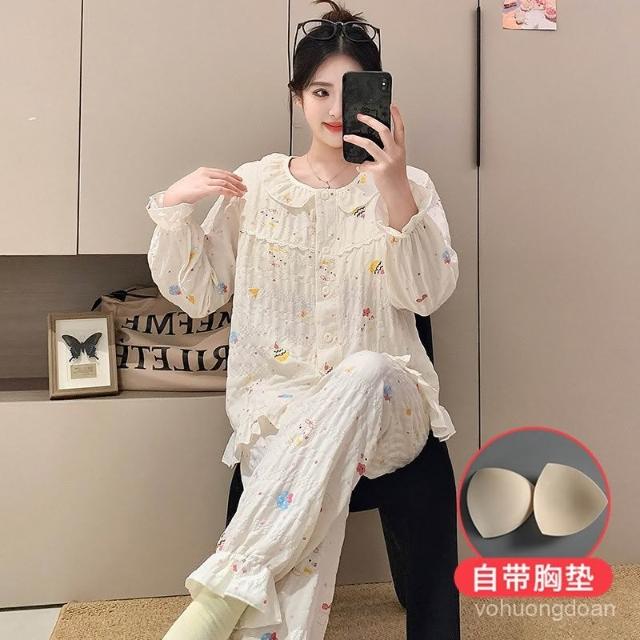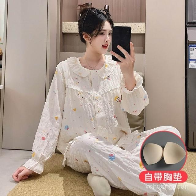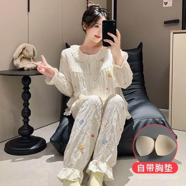 韓版ins雲朵棉睡衣女春秋新款帶胸墊蝴蝶結兔開衫家居服套裝0.0