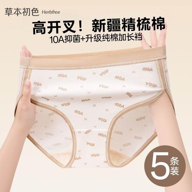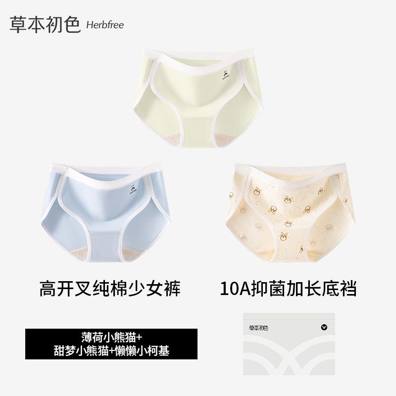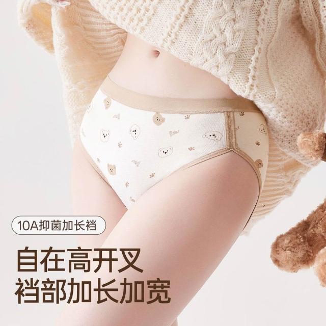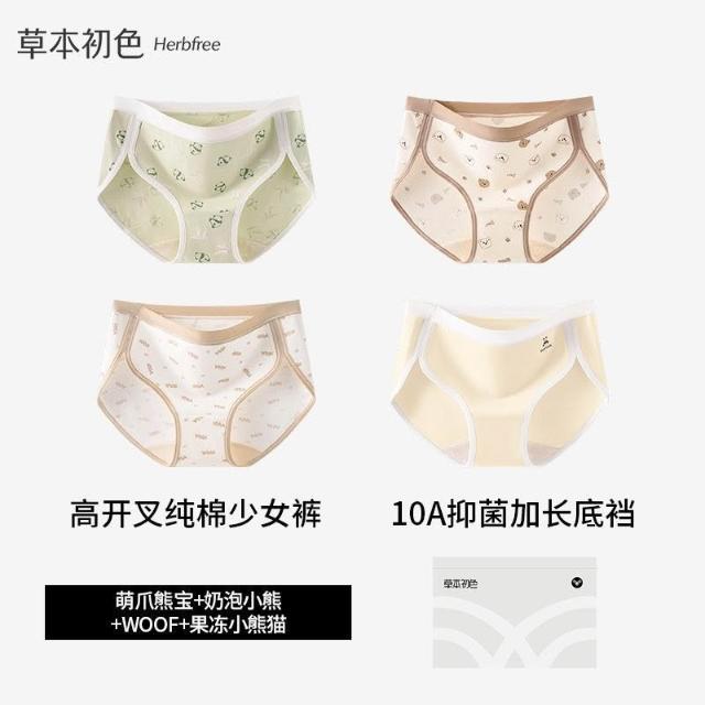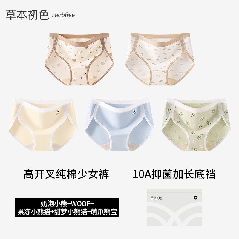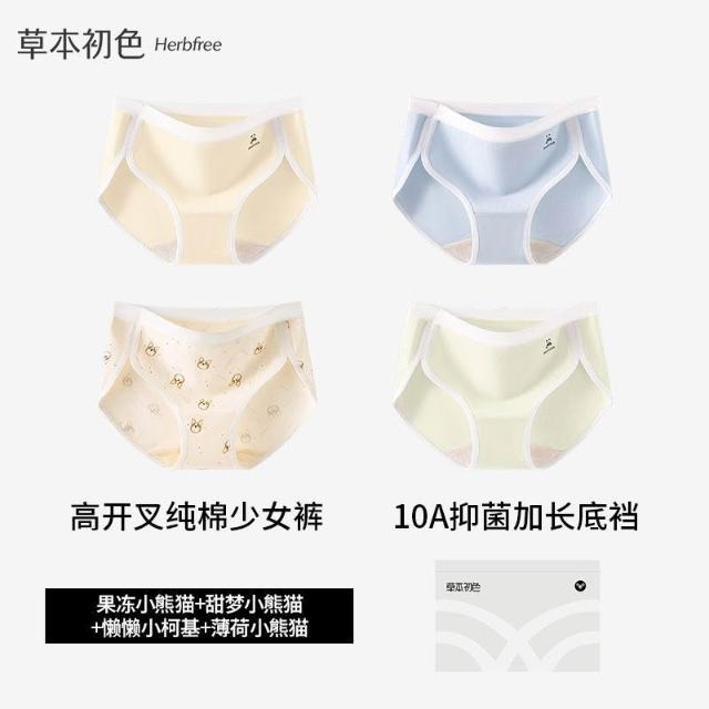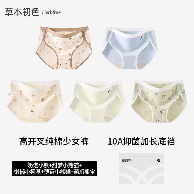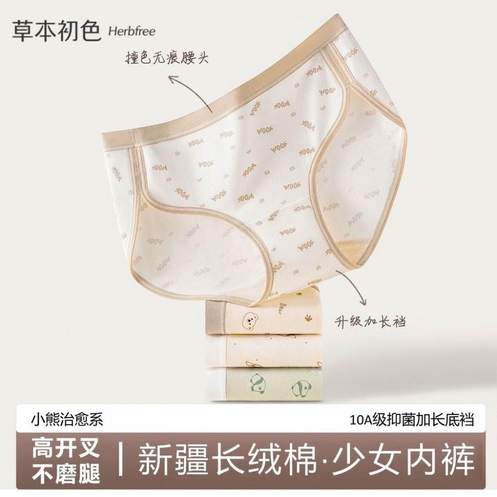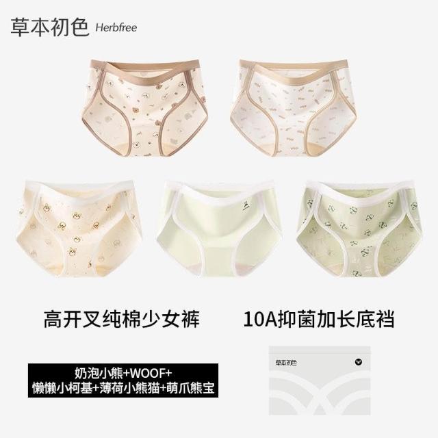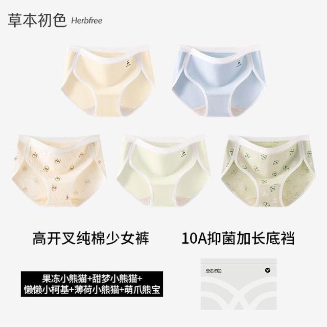 優先購草本初色高開叉純棉內褲女中腰10A抑菌加長襠小熊系少女生三角褲