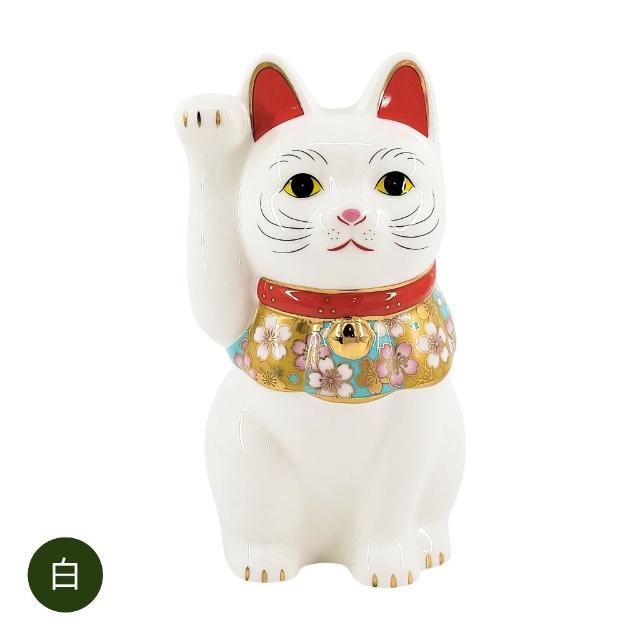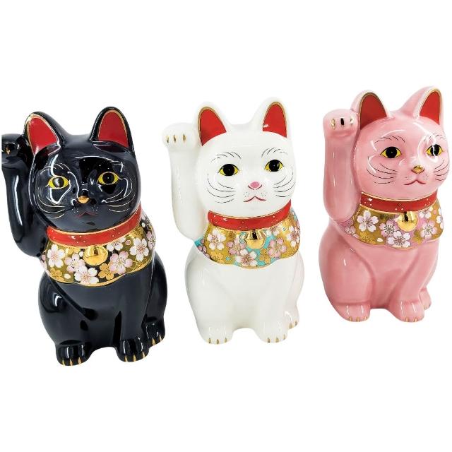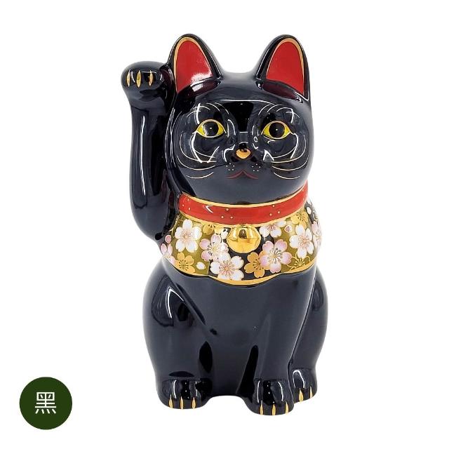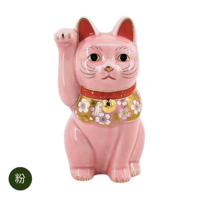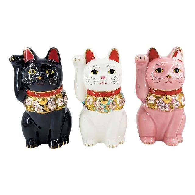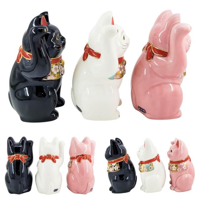 Vintage+。復古家。日本 藥師窯 招財貓 。櫻花 金邊 粉 黑 白 招福 招財 貓 右手 (高16cm/中/特價)