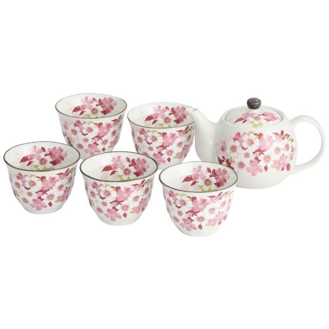 Vintage+。復古家。日本製 美濃燒 和藍 。櫻花 陶瓷 煎茶杯 茶壺 茶組 茶具組 (附茶濾)(6入組)(特價)