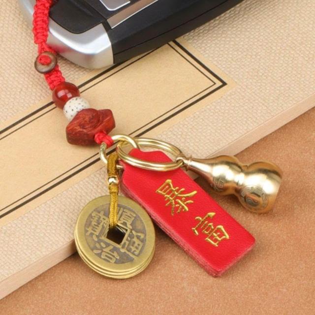 硃砂真皮平安牌鑰匙扣汽車掛件黃銅葫蘆貔貅五帝錢編織繩掛鏈飾品