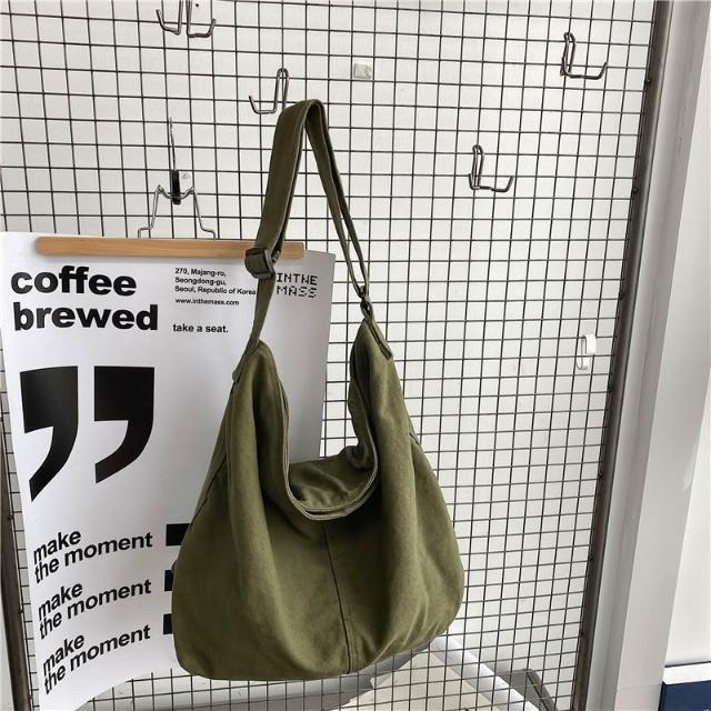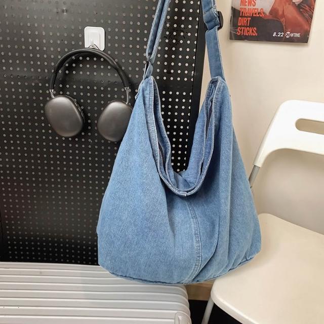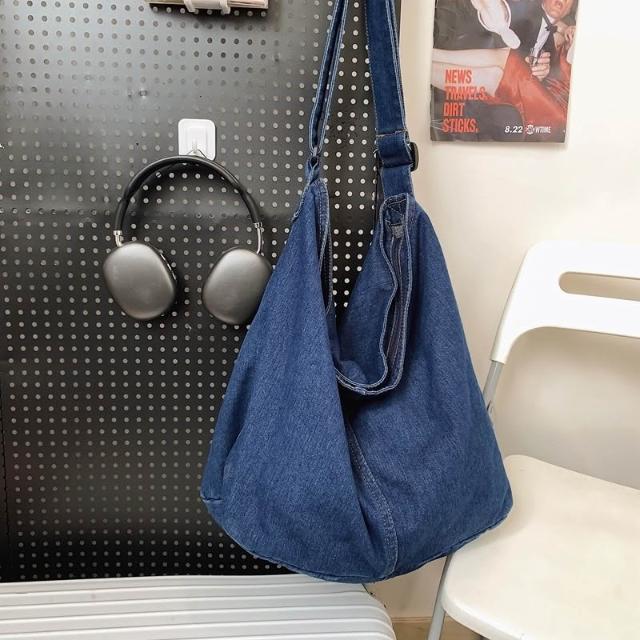 日系簡約 慵懶文藝水洗牛仔帆布包 大容量斜跨包 學生出行通勤必備購物袋