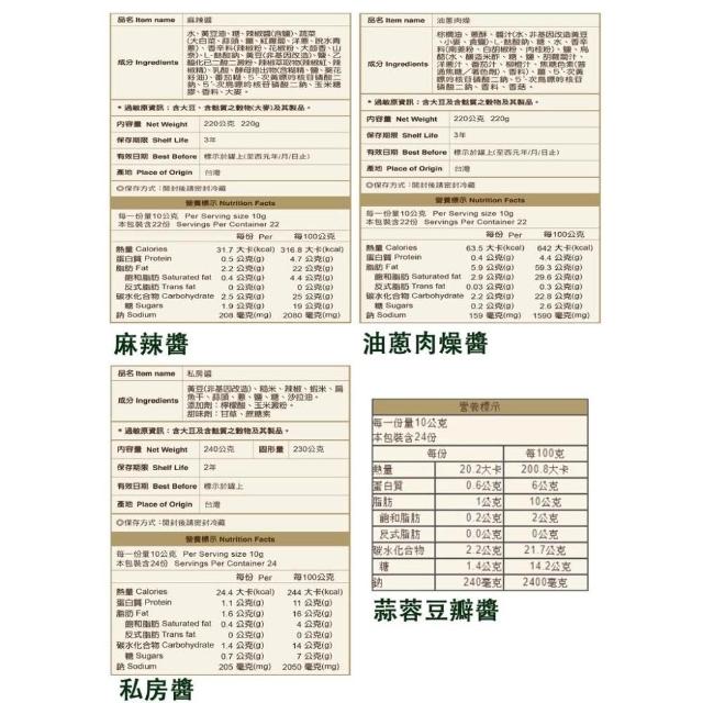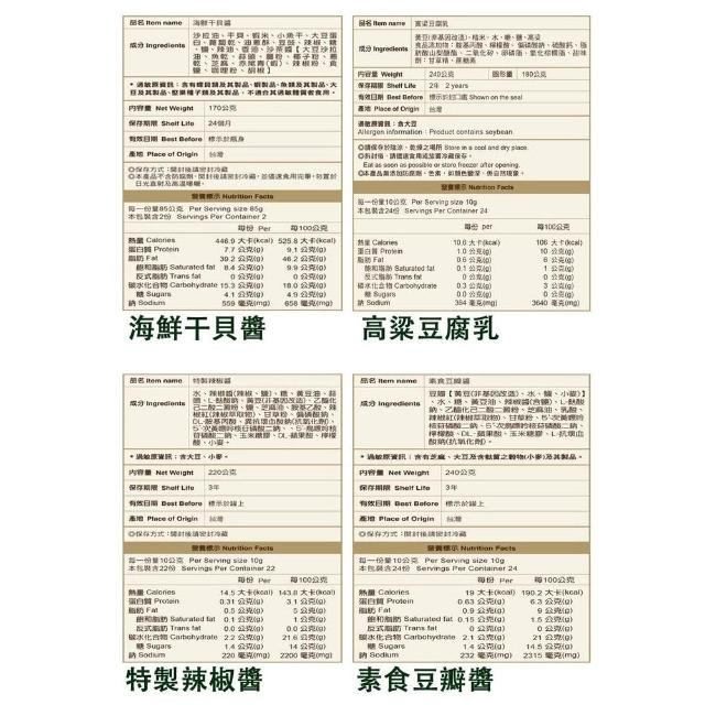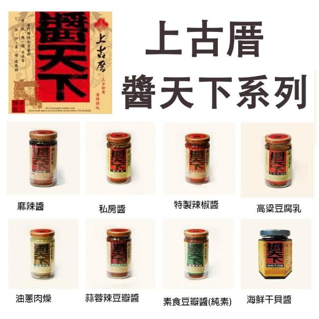 聖祖貢糖聖祖食品 上古厝 醬天下-麻辣醬、油蔥肉燥、私房醬、蒜蓉辣豆瓣醬、素食豆瓣醬(純素)、高粱豆腐乳、海鮮干貝醬
