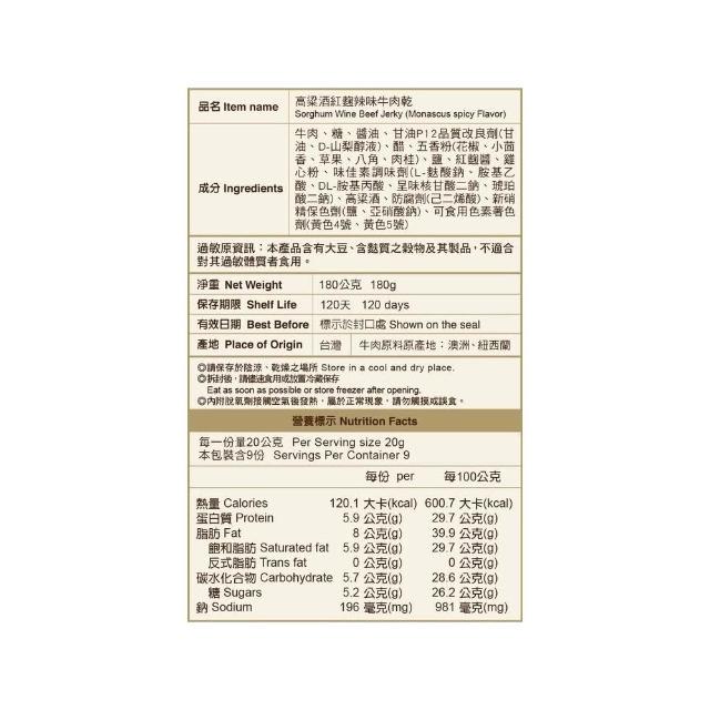 喬安牧場 高粱酒牛肉乾 紅麴辣味牛肉乾170g