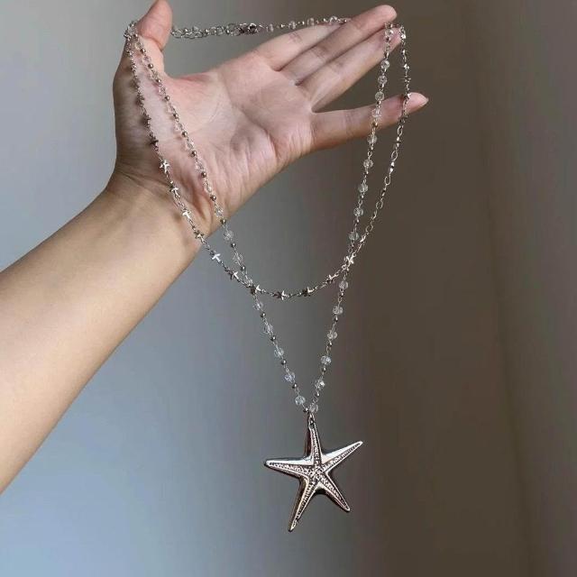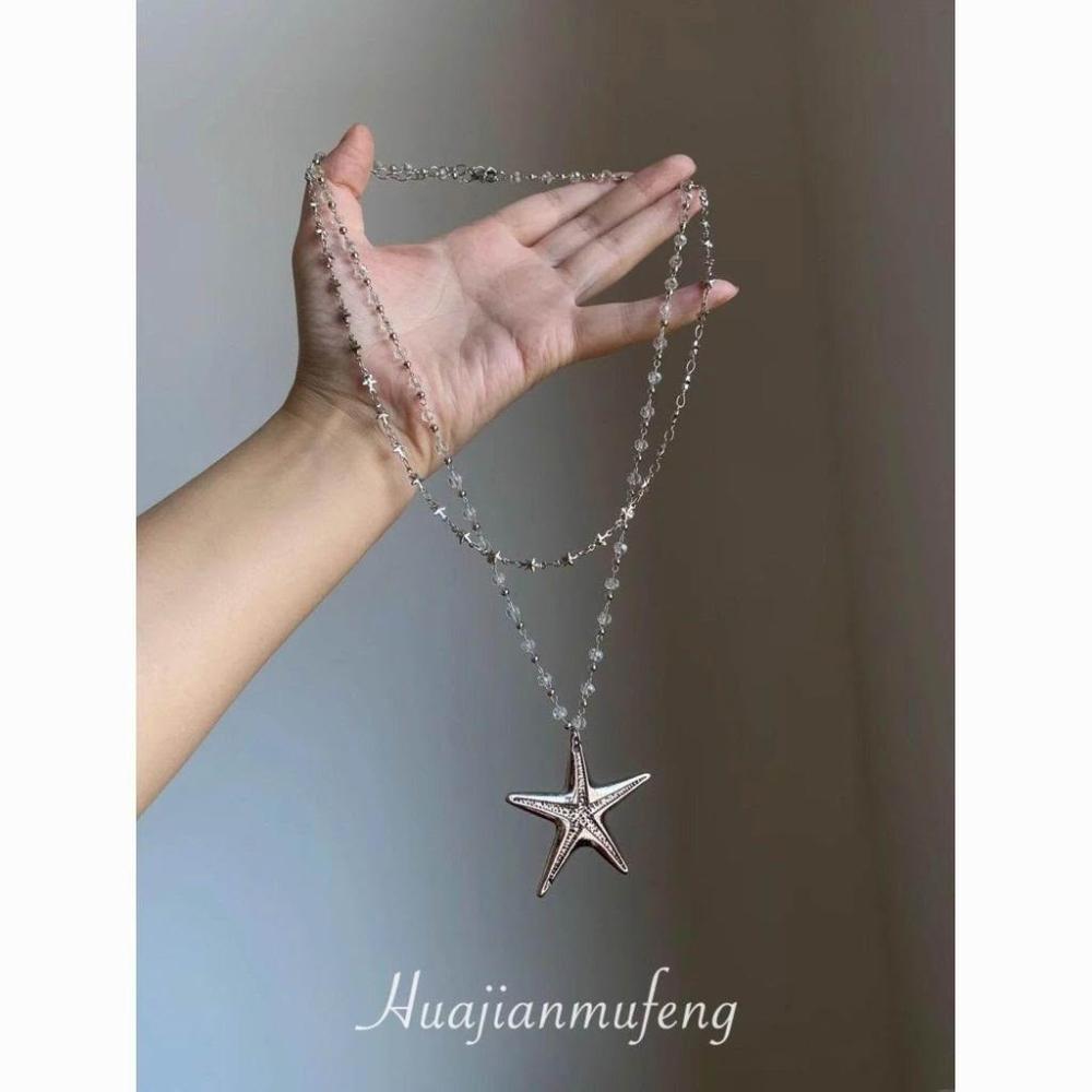 超出片!疊戴雙層項鍊銀色海星吊墜長項鍊毛衣頸鍊千禧辣妹風配飾