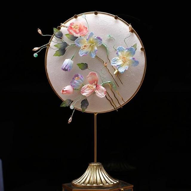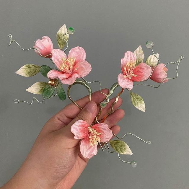 優雅新中式漸變色掐絲絨花藤蔓嫩芽花枝頭飾髮簪套裝新娘頭花3支