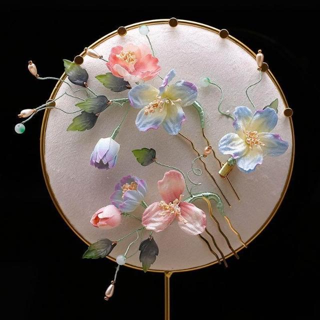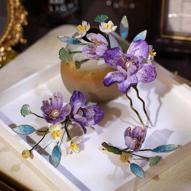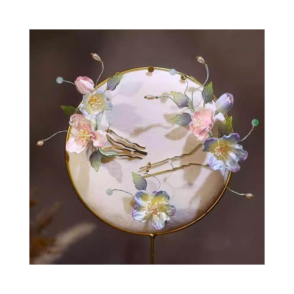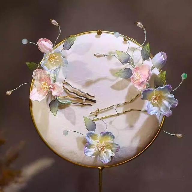 優雅新中式漸變色掐絲絨花藤蔓嫩芽花枝頭飾髮簪套裝新娘頭花3支