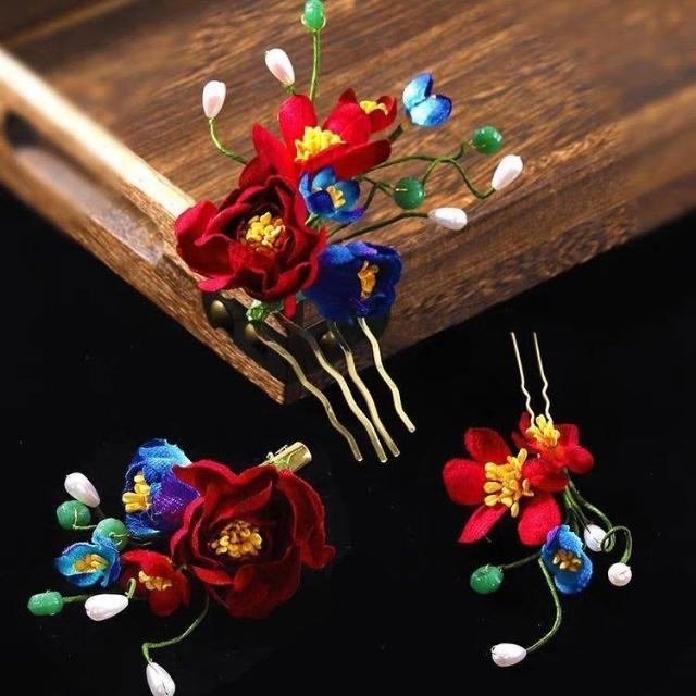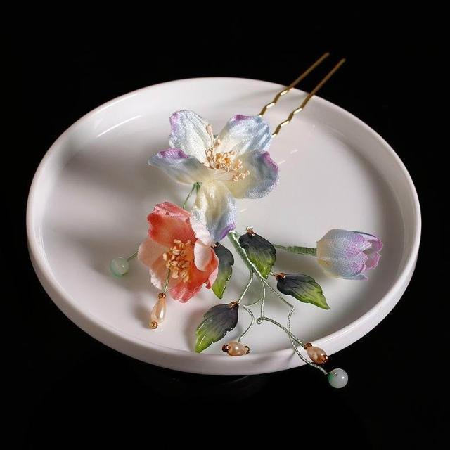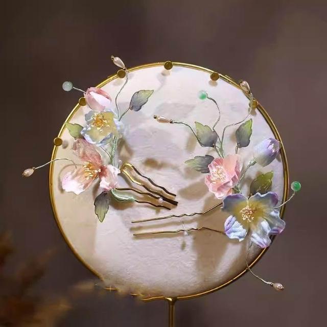 優雅新中式漸變色掐絲絨花藤蔓嫩芽花枝頭飾髮簪套裝新娘頭花3支