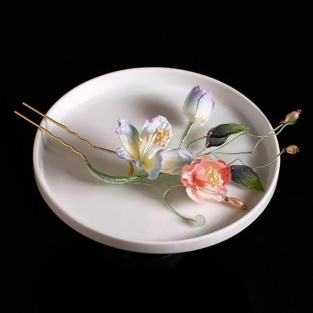 優雅新中式漸變色掐絲絨花藤蔓嫩芽花枝頭飾髮簪套裝新娘頭花3支