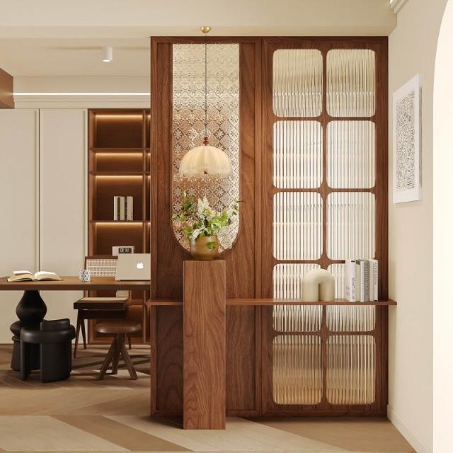 屏風隔斷 新中式客廳實木入戶遮擋 玻璃鏤空玄關辦公室正對門格柵