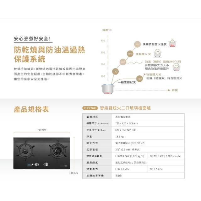 SAKURA 櫻花G2926G 智能雙炫火二口玻璃檯面爐 創新專利雙炫火 智能乾燒檢知與過溫保護裝置