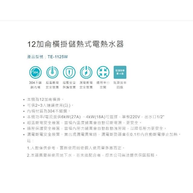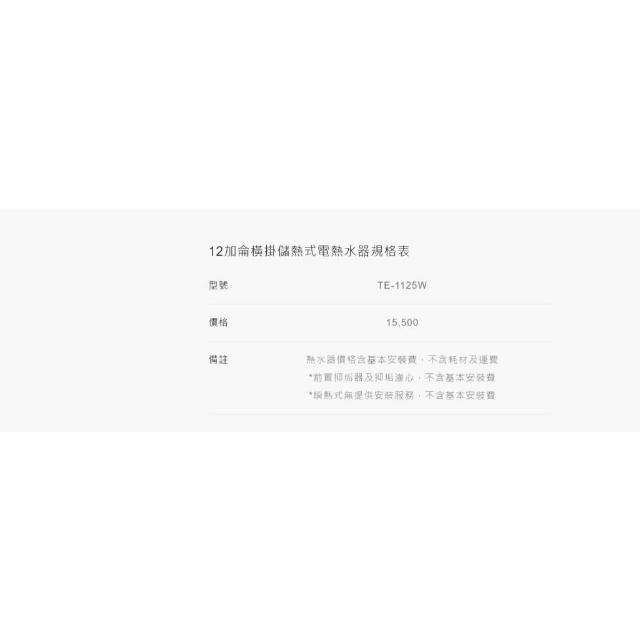 莊頭北TE-1125W 12加侖橫掛儲熱式電熱水器 304不鏽鋼內桶 適用窄小空間 能源效率四級