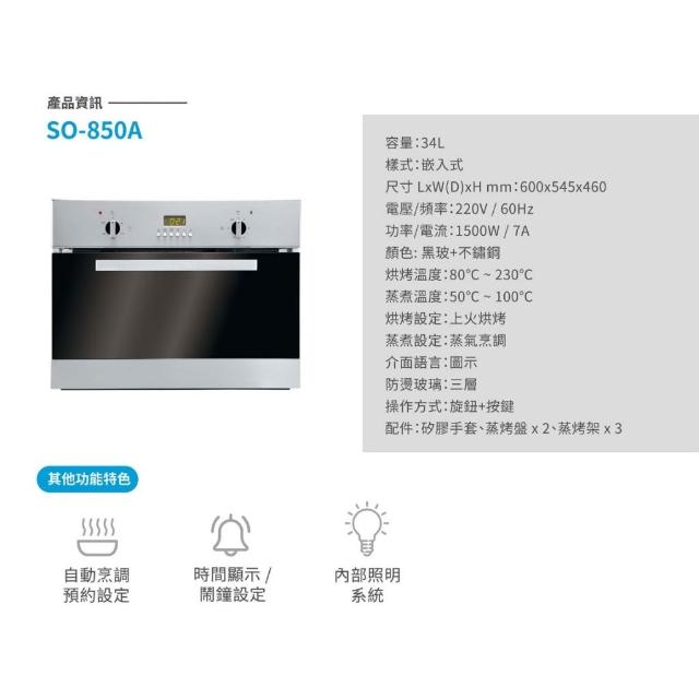 BEST 貝斯特智慧型蒸烤爐 SO-850A 崁入式 自動烹調預約 業界獨家免除鈣系統 34公升 不鏽鋼