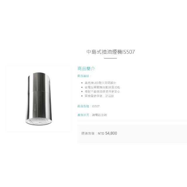 BEST 貝斯特中島式抽油煙機 IS507 歐式圓柱型設計除油煙機 高吸附不鏽鋼濾油網 三段風速 省電延遲關機