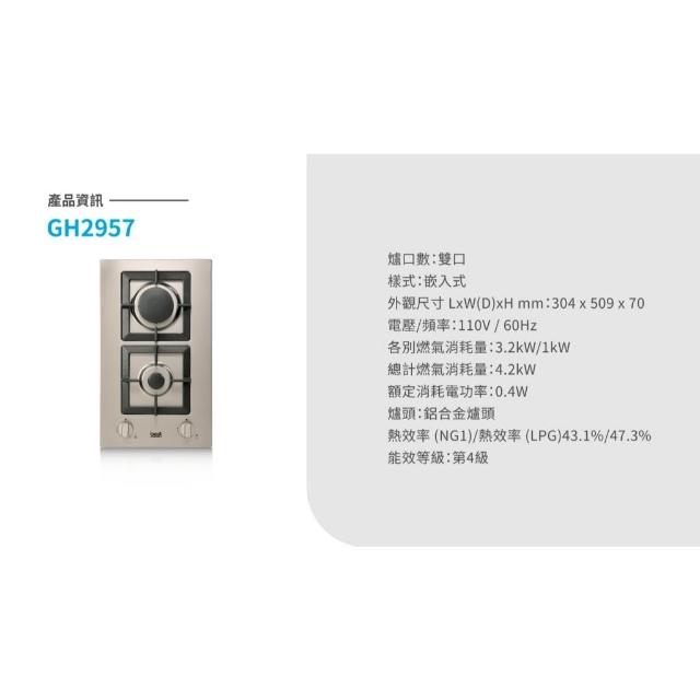 BEST 貝斯特GH2957 不鏽鋼雙口高效能瓦斯爐 熱效能高 多段式火力 油漬湯汁易清理 平面設計符合人體工學