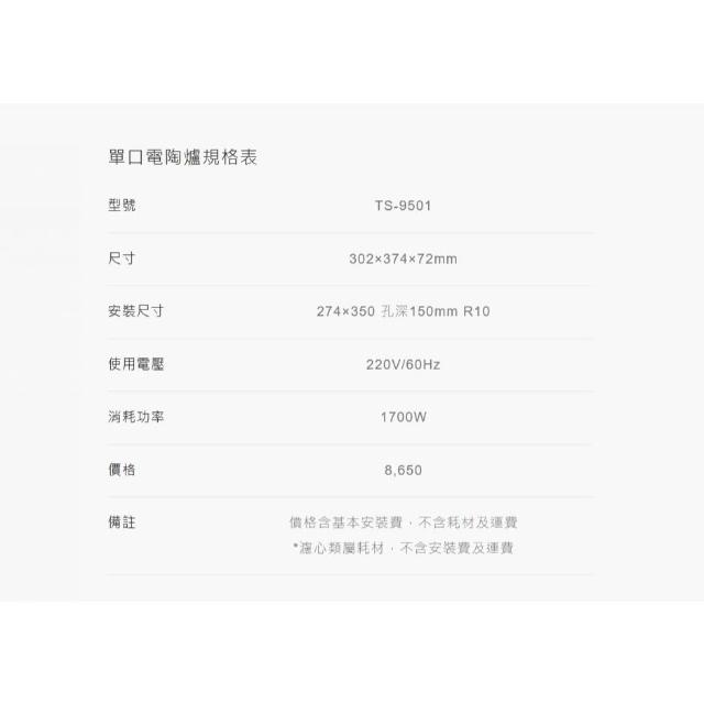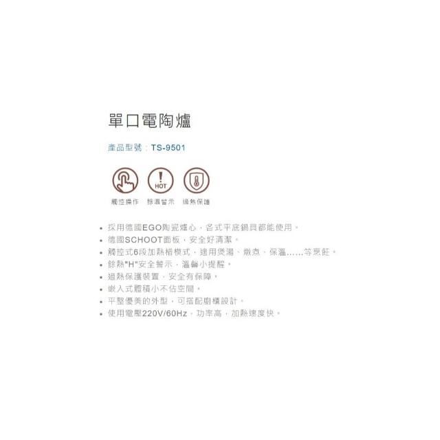 莊頭北TS-9501 單口電陶爐 德國EGO陶瓷爐心 德國SCHOOT面板 觸控式6段加熱棤模式