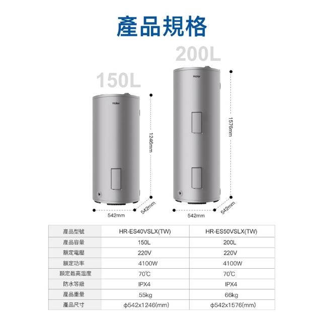 Haier 海爾200L鋯金搪瓷儲熱式電熱水器 落地式 HR-ES50VSLX(TW) 50k加侖 多重防護功能