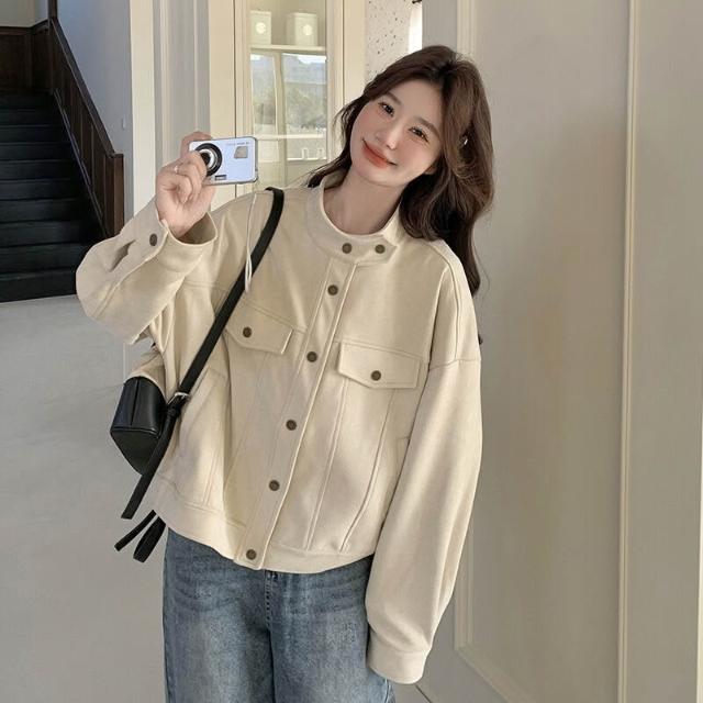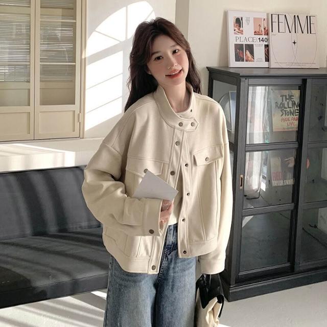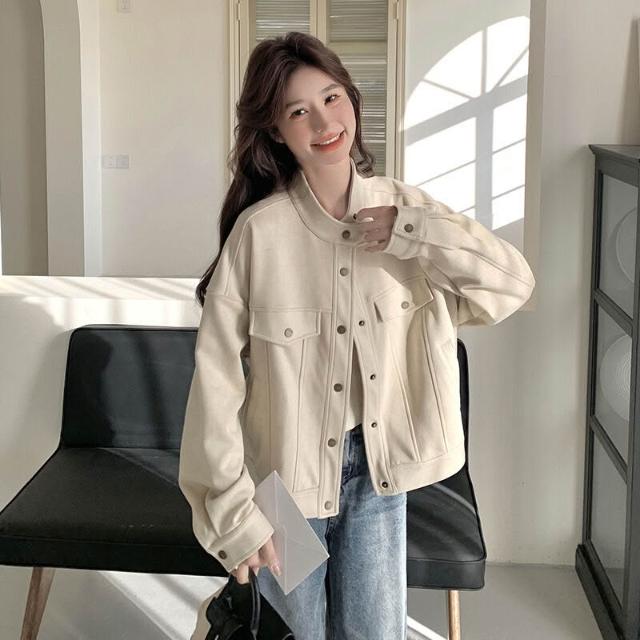 米白色麂皮絨短外套女2025春季新款韓系高級感小個子立領工裝夾克 15f