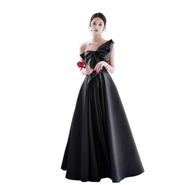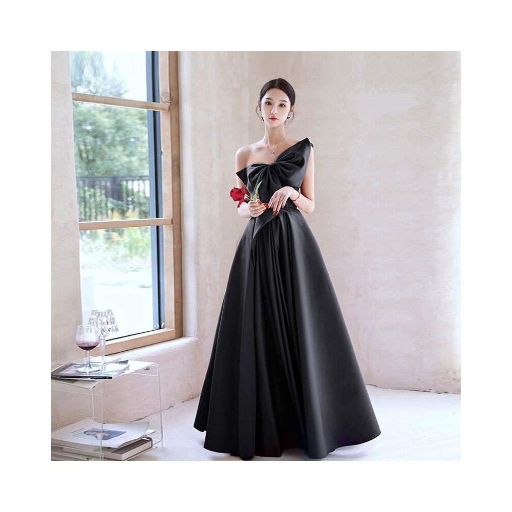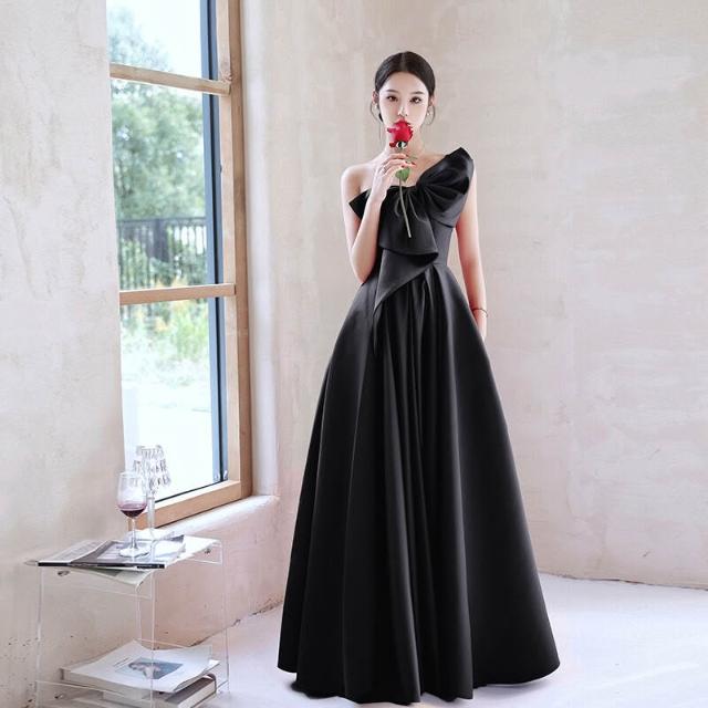PEZK優選 黑色晚禮服2025新款秋冬緞面禮服女抹胸長款公司年會畢業禮服