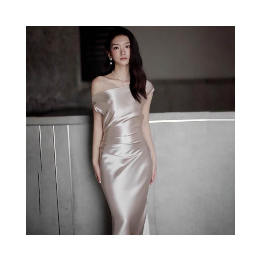 PEZK優選 法式緞面香槟金色斜肩晚禮服2025新款訂婚演出主持人小禮服連衣裙