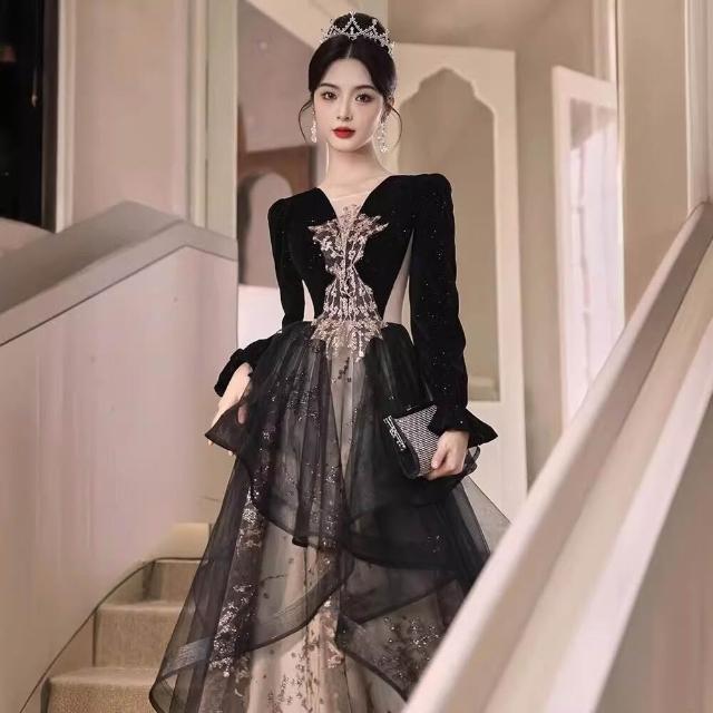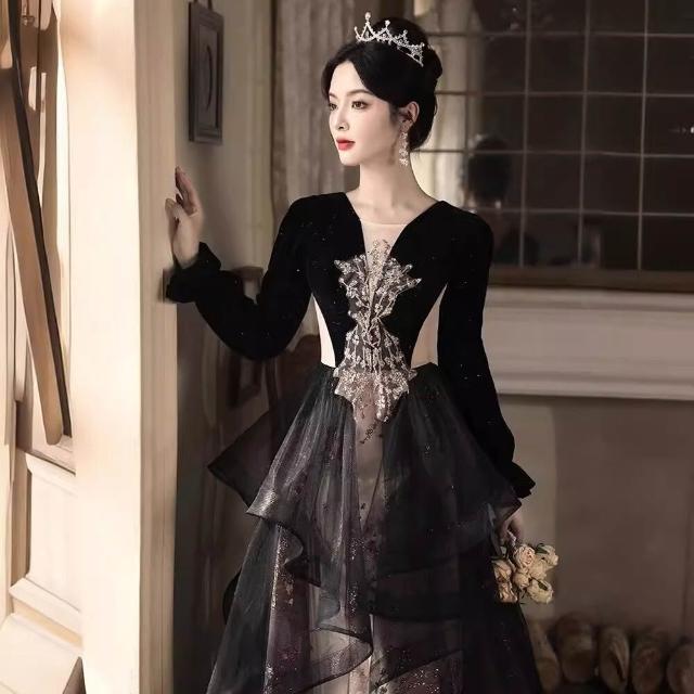 PEZK優選 黑色晚禮服2025新款法式高級感輕奢小眾高端晚宴年會主持藝考長袖