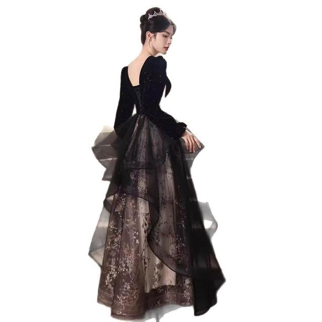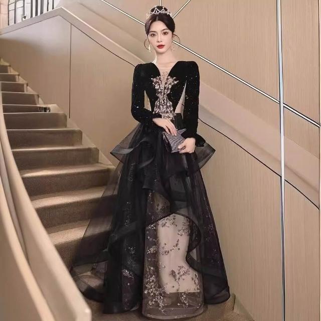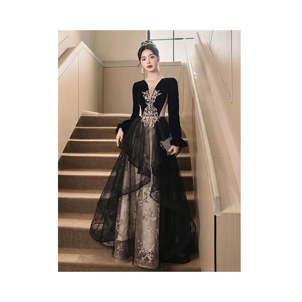 PEZK優選 黑色晚禮服2025新款法式高級感輕奢小眾高端晚宴年會主持藝考長袖