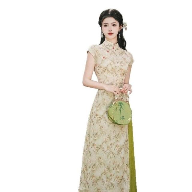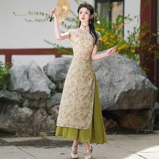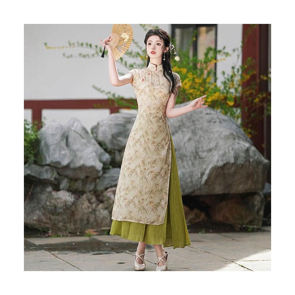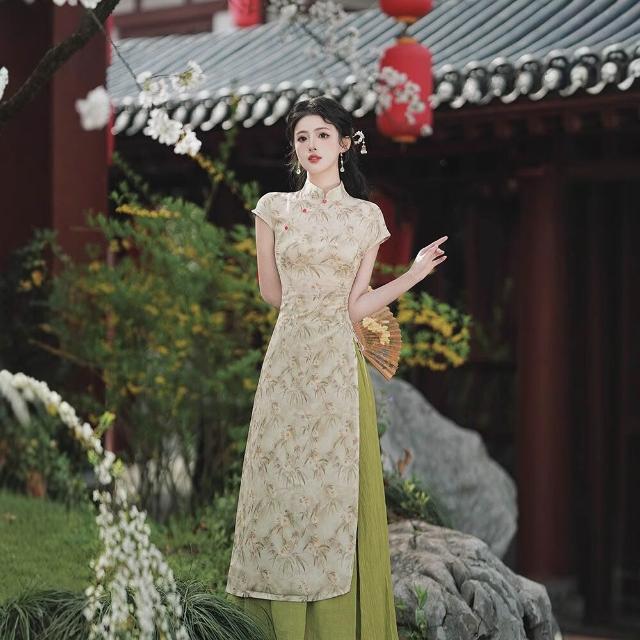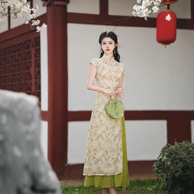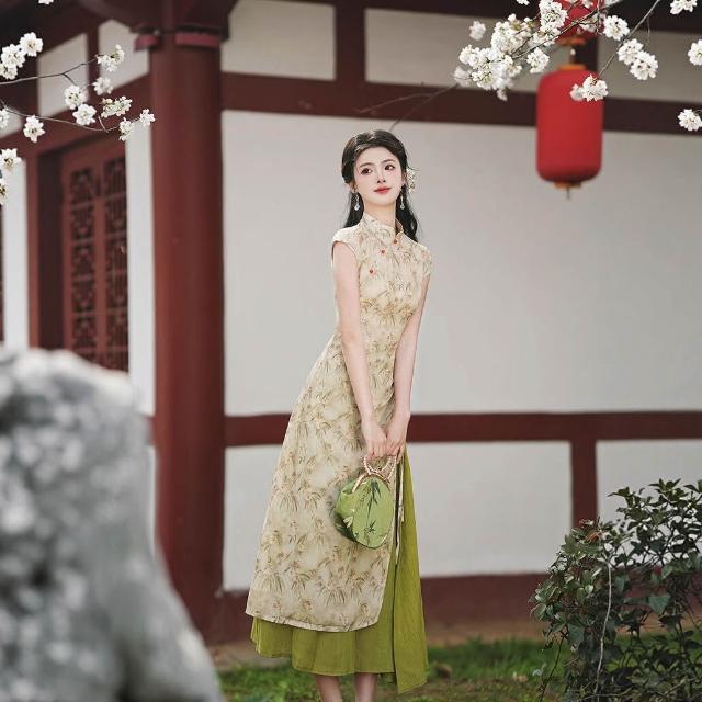 PEZK 優選 PEZK 優選 新中式清冷感禅意絕美改良綠色旗袍日常可穿水墨連衣裙穿搭套裝夏 afe 996