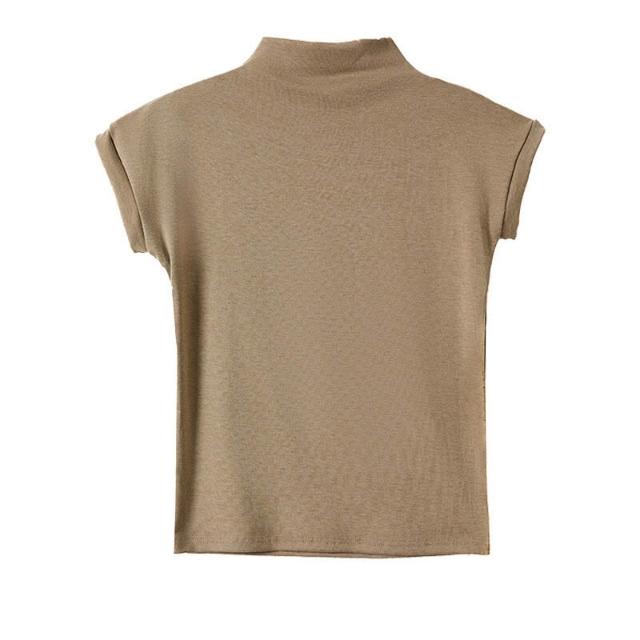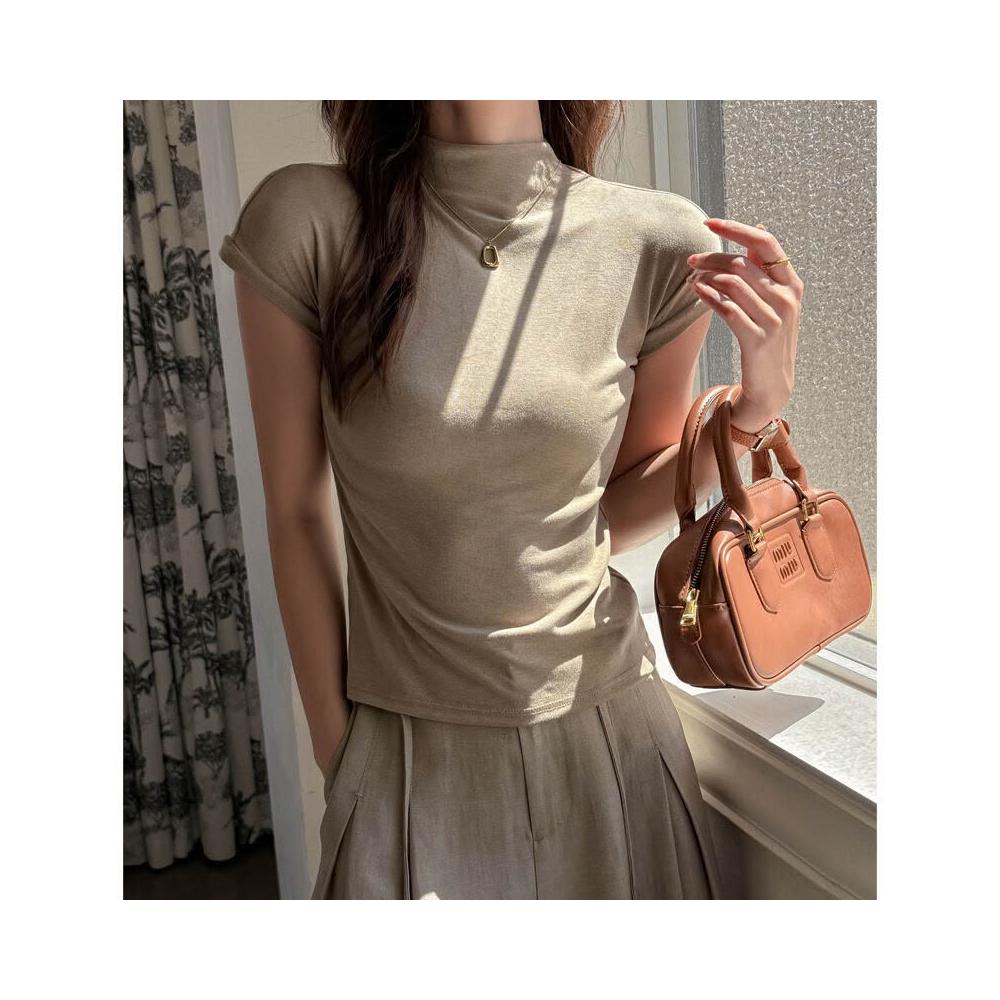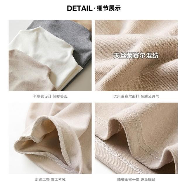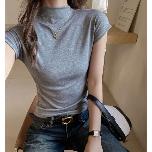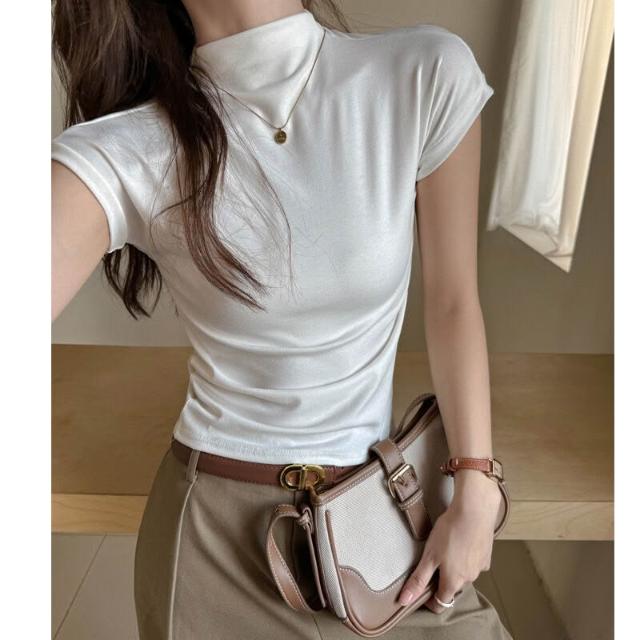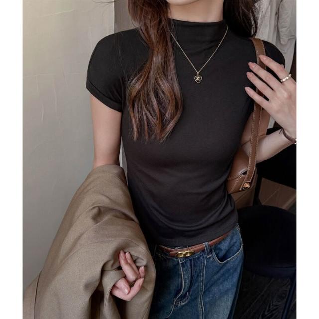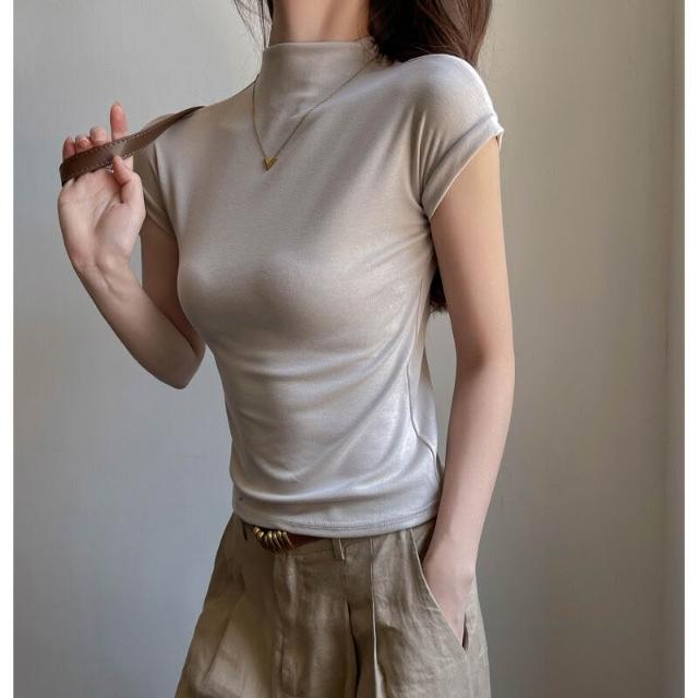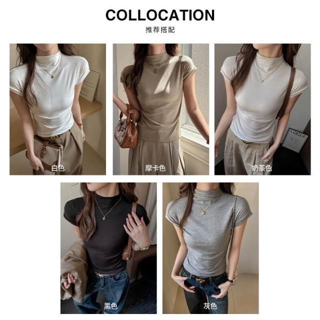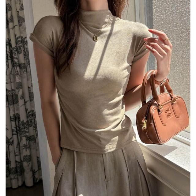 早秋季萊賽爾天絲半高領正肩短袖t恤女內搭高級感修身顯瘦打底衫 f32