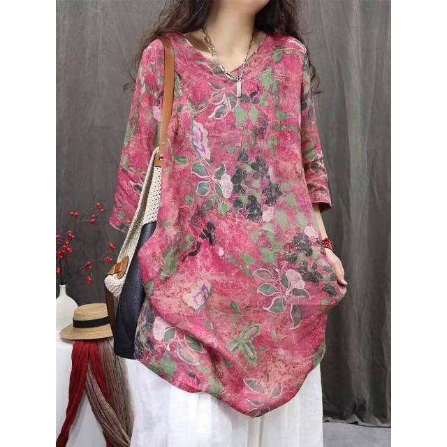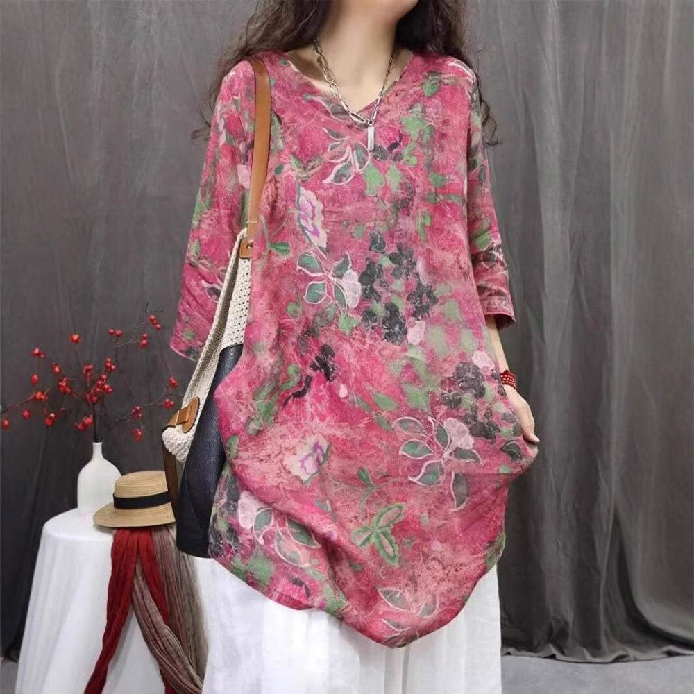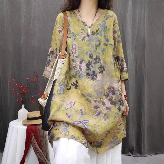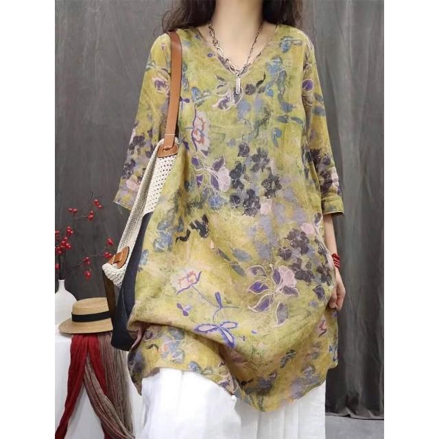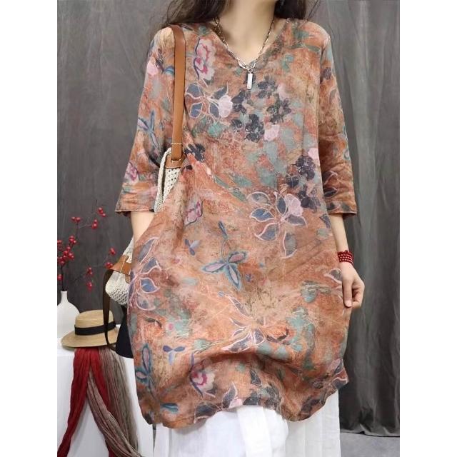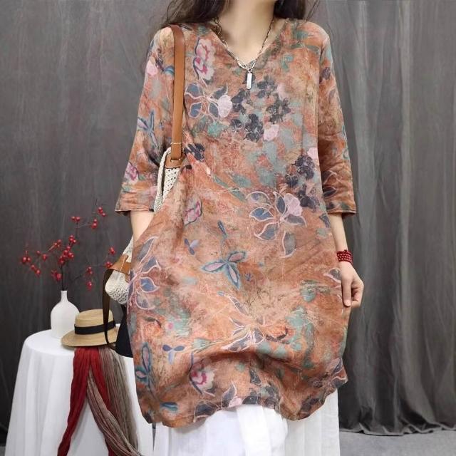 棉麻印花女2026春夏秋新款中國風復古中袖上衣長T連衣裙 15b