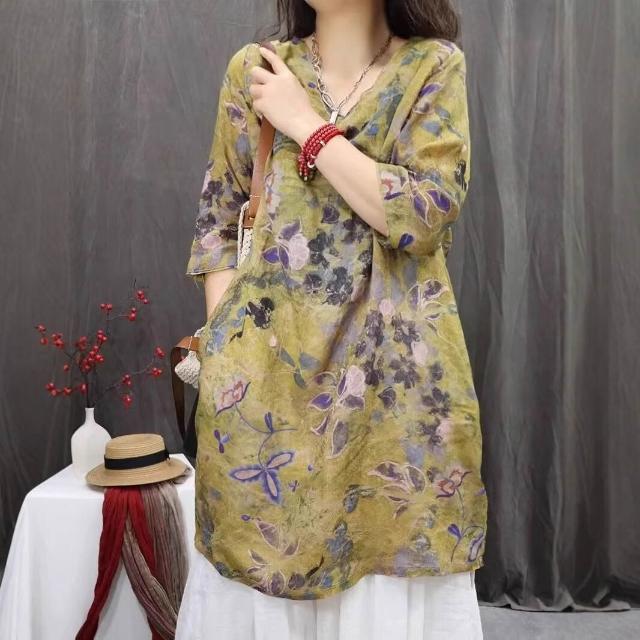 棉麻印花女2026春夏秋新款中國風復古中袖上衣長T連衣裙 15b