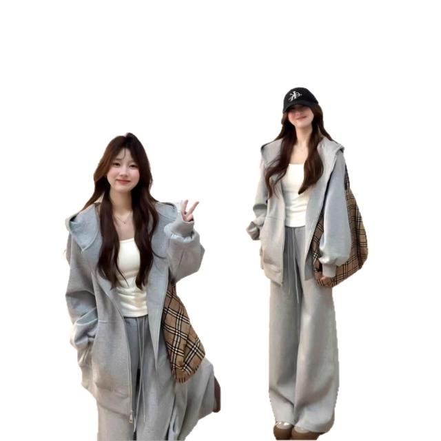 灰色休閑運動套裝早春穿搭巨好看韓系一整套衛衣衛褲運動裝兩件套 70d