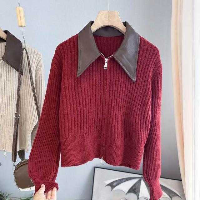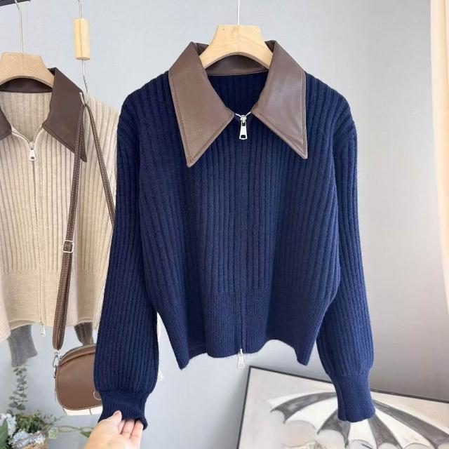 洋氣感拼接皮領毛衣外套女2026春裝新款修身顯瘦針織開衫上衣 785
