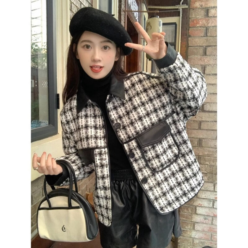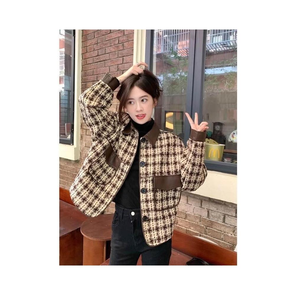 小香風千鳥格外套女秋冬新款復古拼接設計感短款寬松大衣長袖上衣 912
