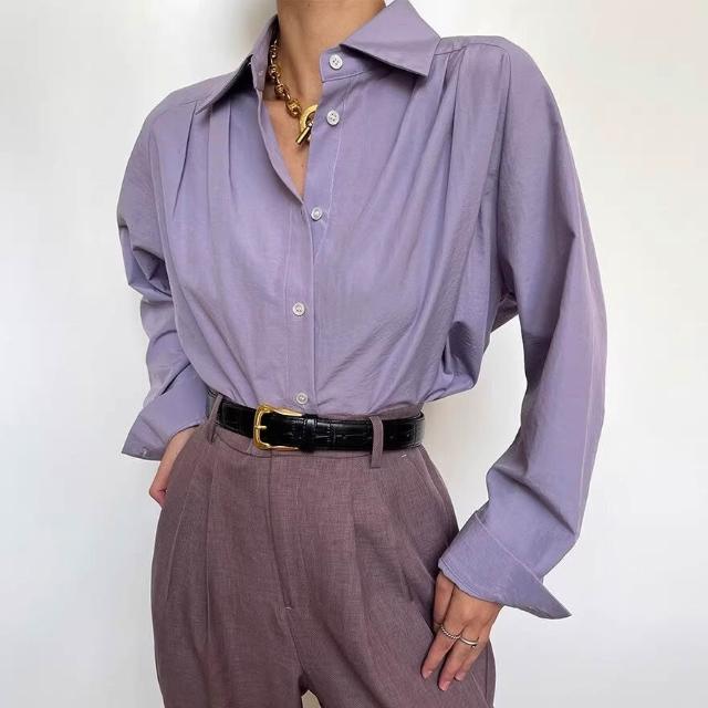 三所vintage 復古抗皺插肩袖紫色襯衫女秋法式別致古著女襯衣高級 b04