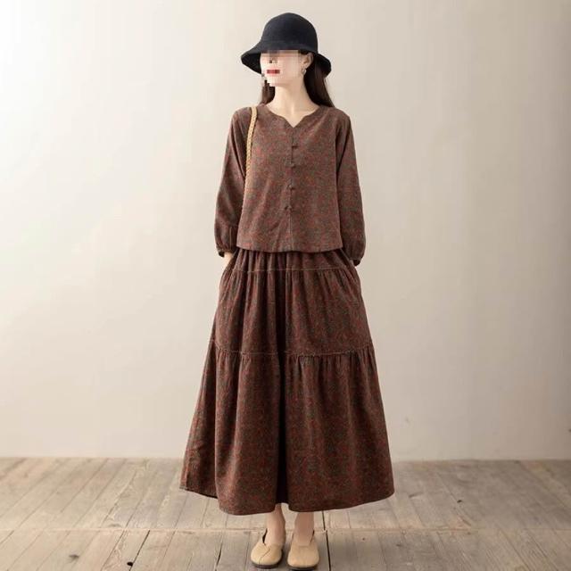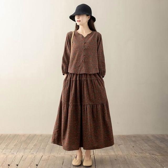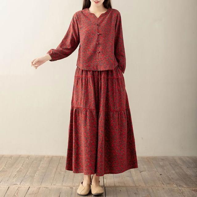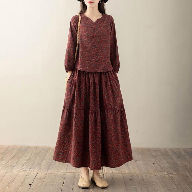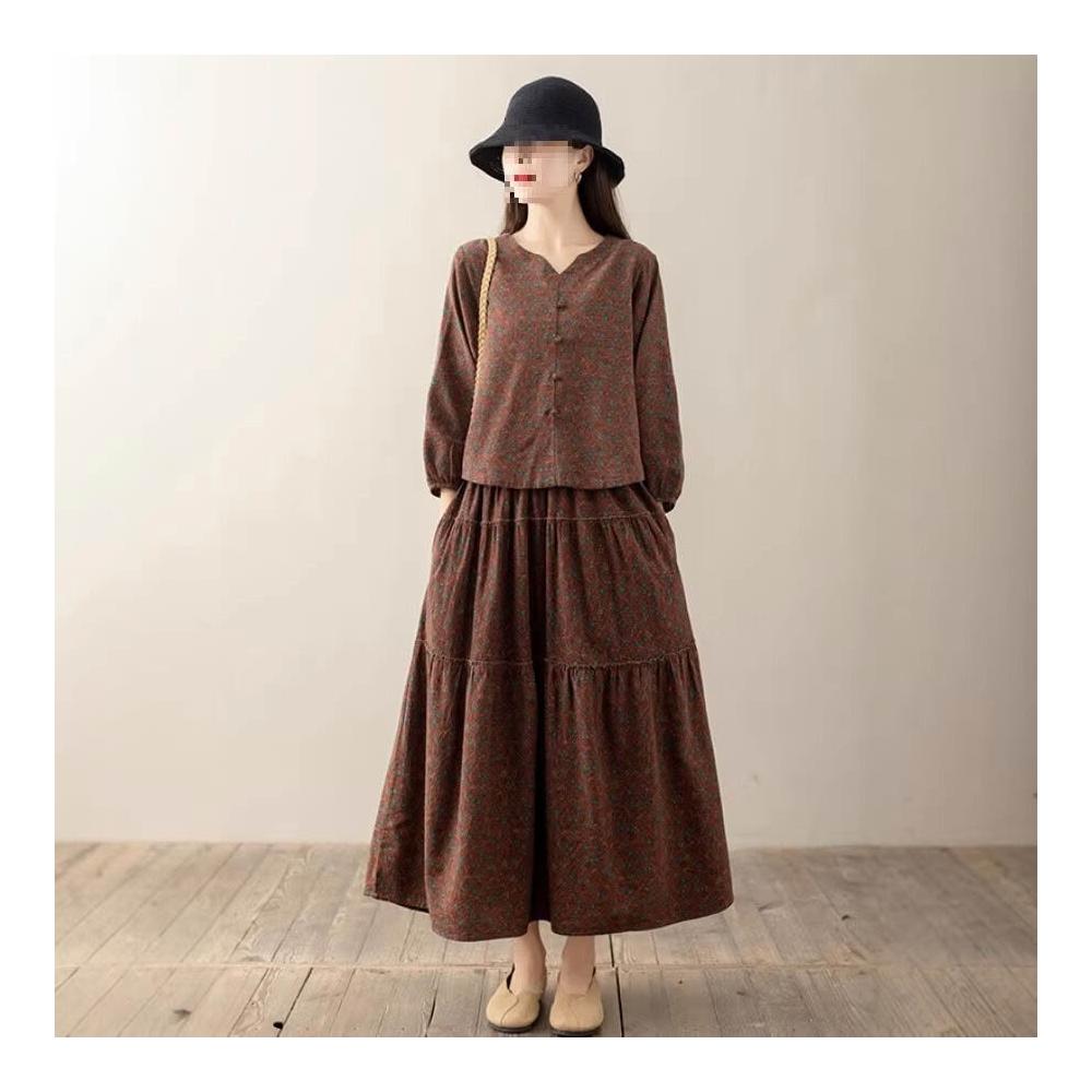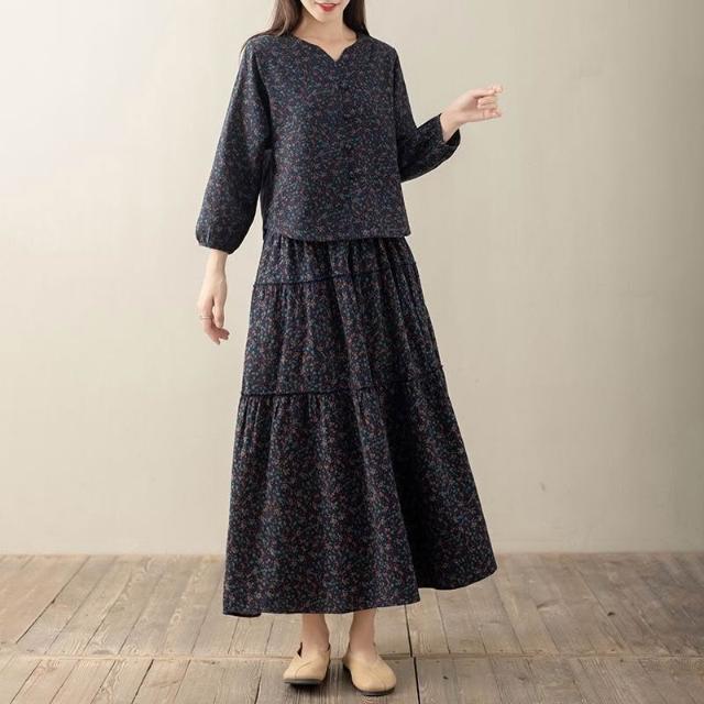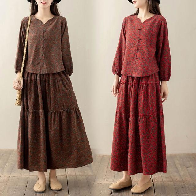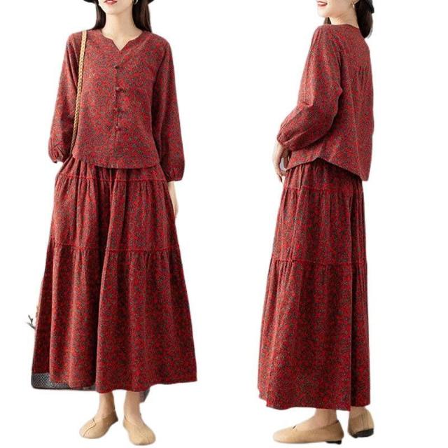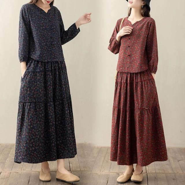 新款復古民族風棉麻套裝女春秋兩件套小碎花半身裙棉麻襯衫新品款 6ce