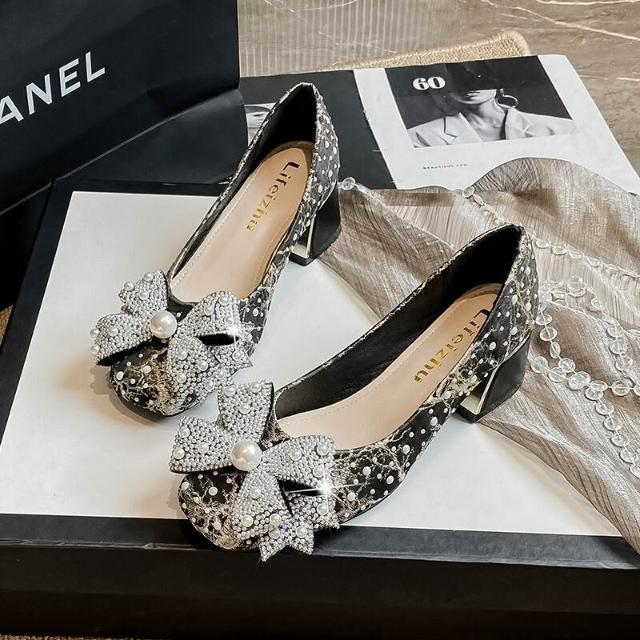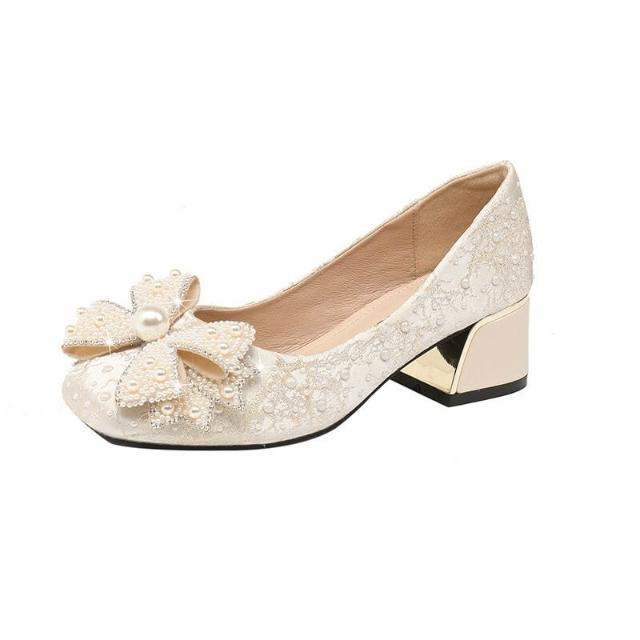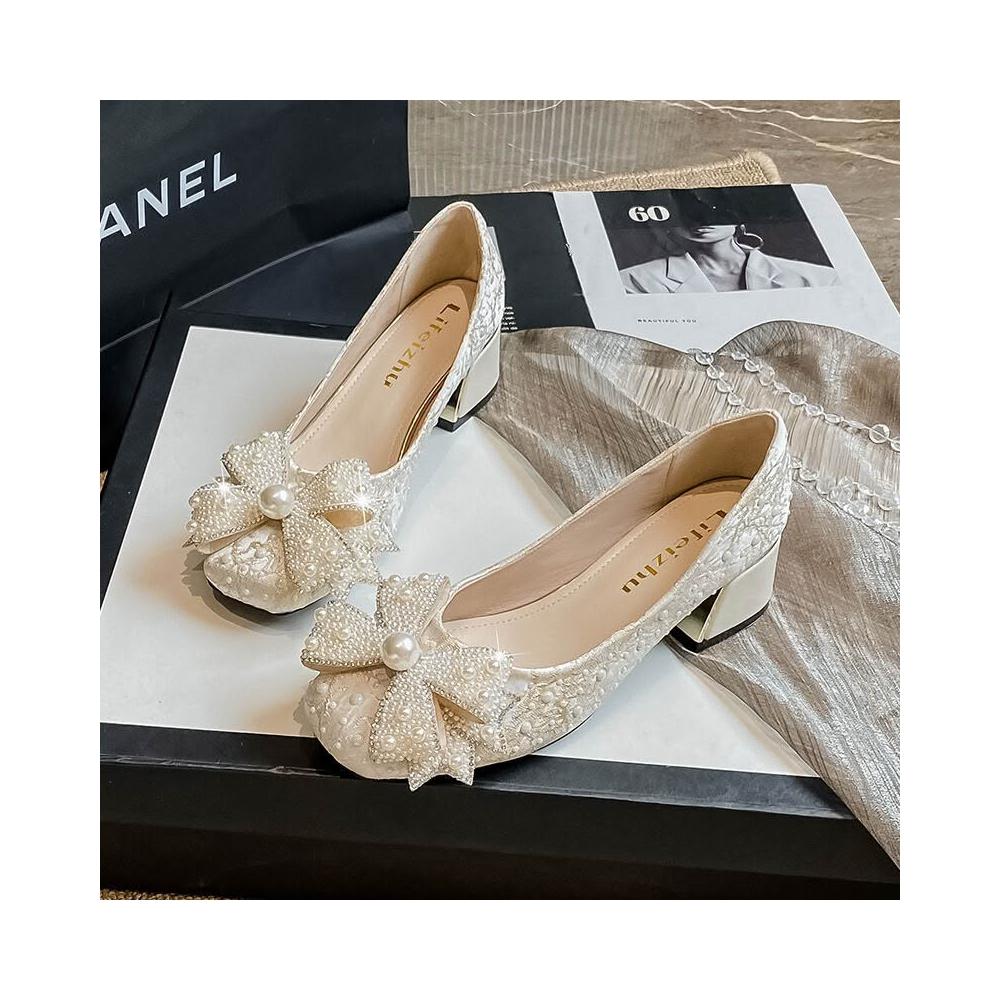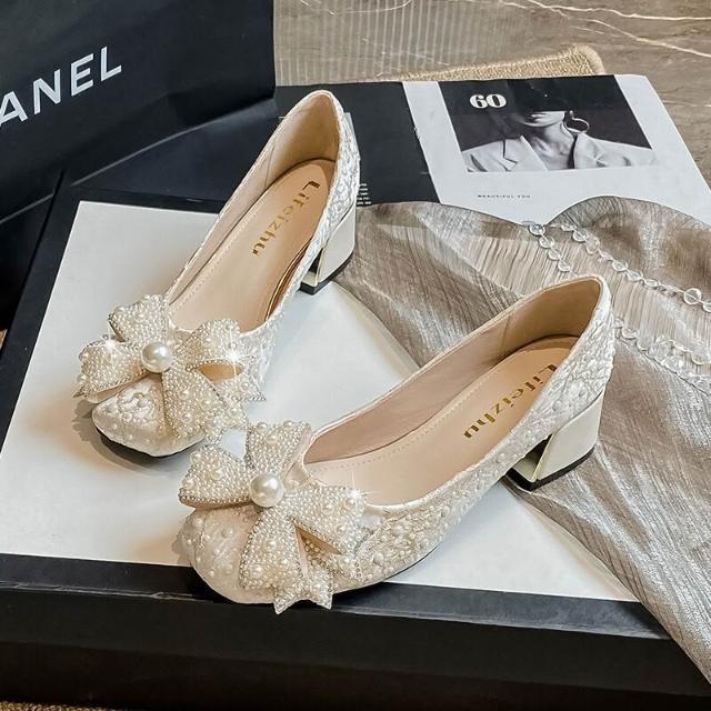 大碼女鞋41-43珍珠法式粗跟中跟單鞋女流行新款秋季百搭 4d6