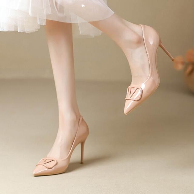 裸色高跟鞋女2025新款V家扣尖頭細跟法式漆皮淺口秋季氣質單鞋冬 60e