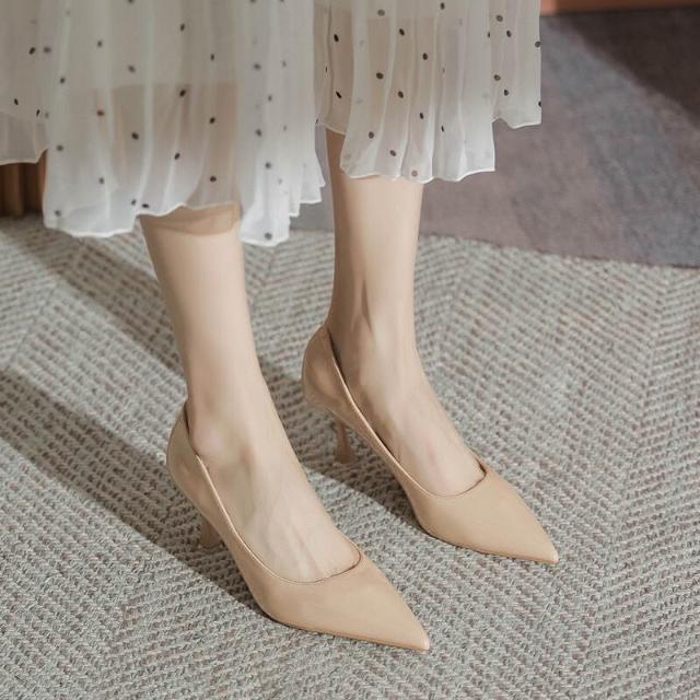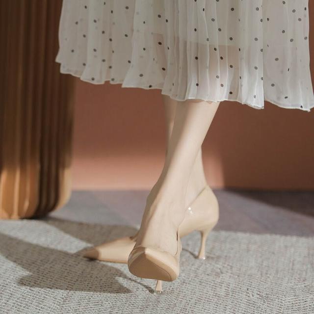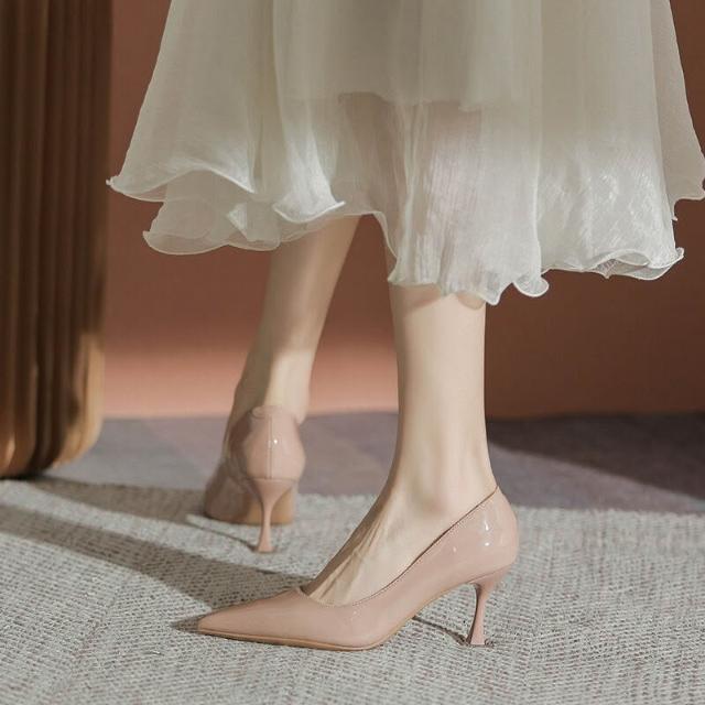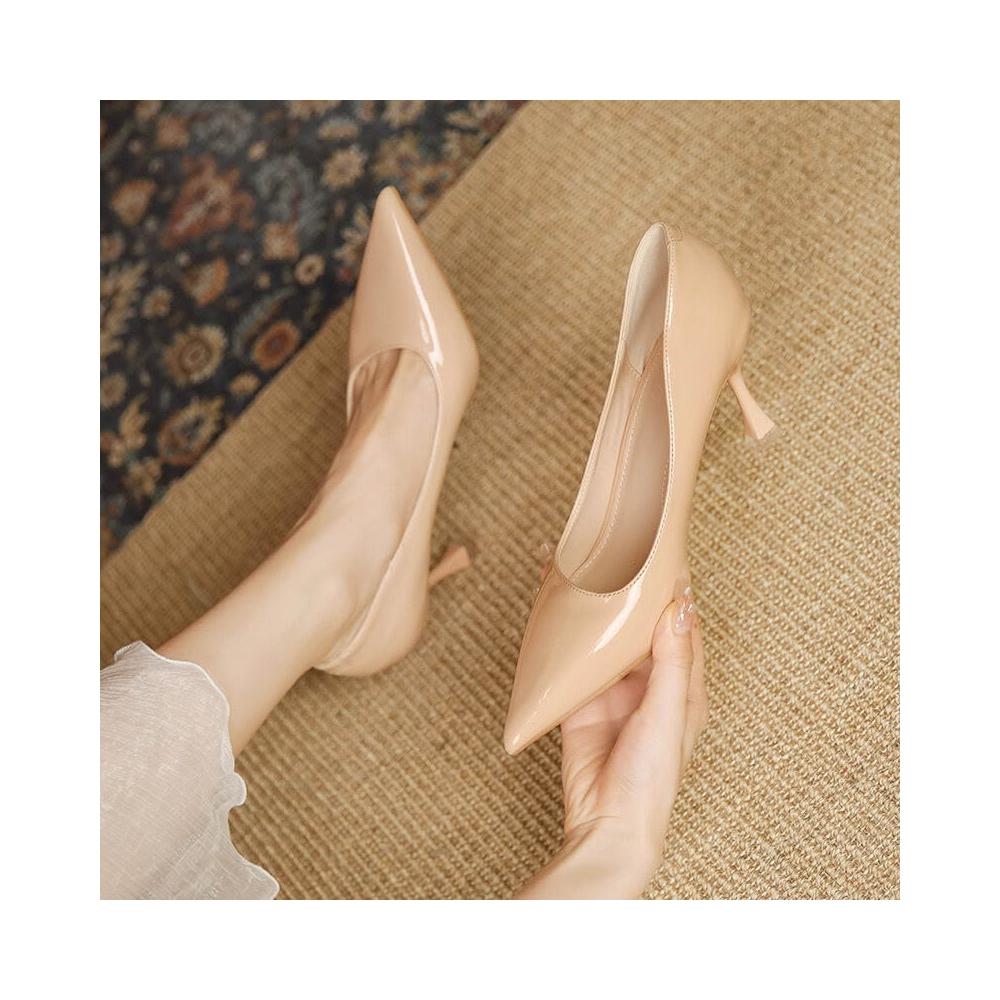裸色漆皮高跟鞋女細跟高級感時尚尖頭淺口跟鞋春季新款單鞋女 ca5