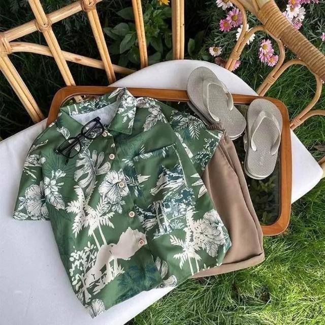 童裝 兒童襯衫 兒童短袖襯衫 男童滿印襯衫 印花襯衫 男童翻領上衣 渡假風襯衫