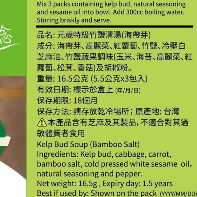 元歲本舖 (純素)特級竹鹽清湯(海帶芽) 3入/盒