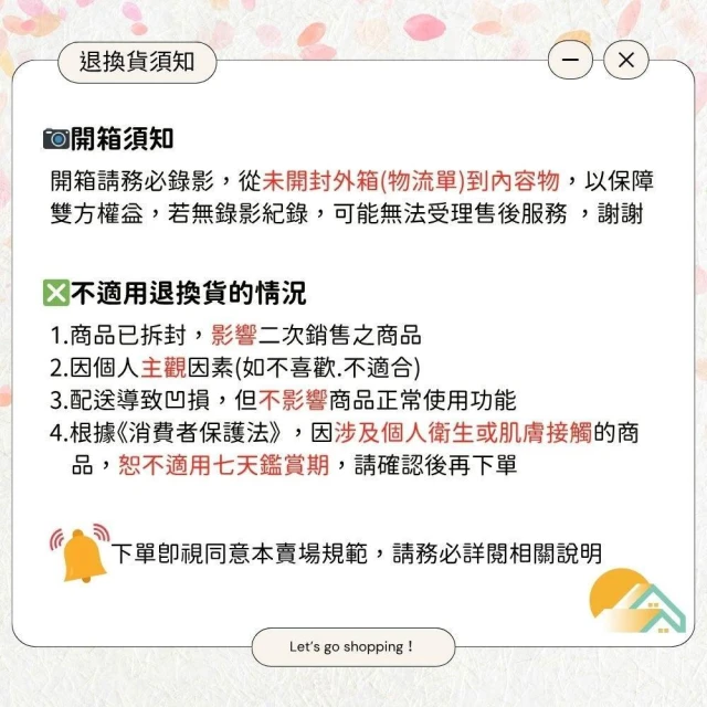 - 個人衛生用品除商品本身有瑕疵外,未拆封商品仍享有十天猶豫期之退貨權利。但已拆封 (如剪標、下水等情形…),依據《通訊交易解除權合理例外情事適用準則》第二條規定,商店無法接受退換貨。