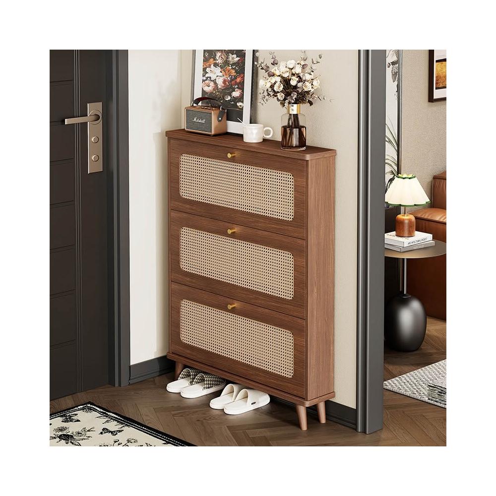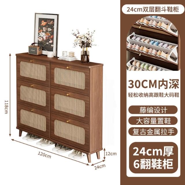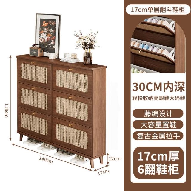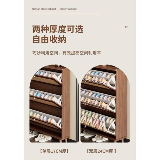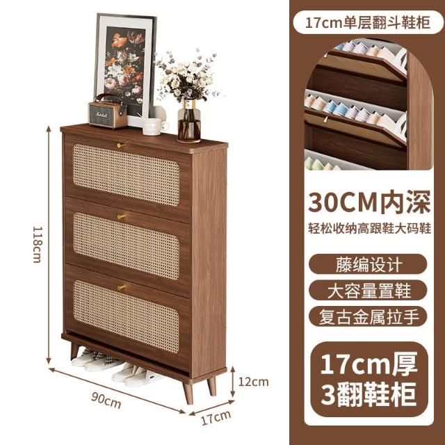 免運 超薄鞋櫃 鞋櫃 玄關鞋櫃 翻斗鞋柜藤編超薄鞋櫃家用門口2025新款中古風玄關櫃入戶胡桃色翻斗窄鞋架