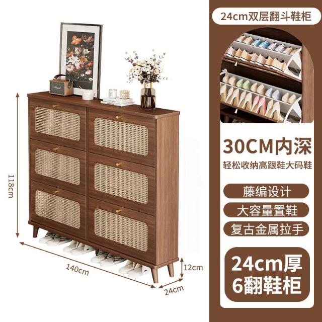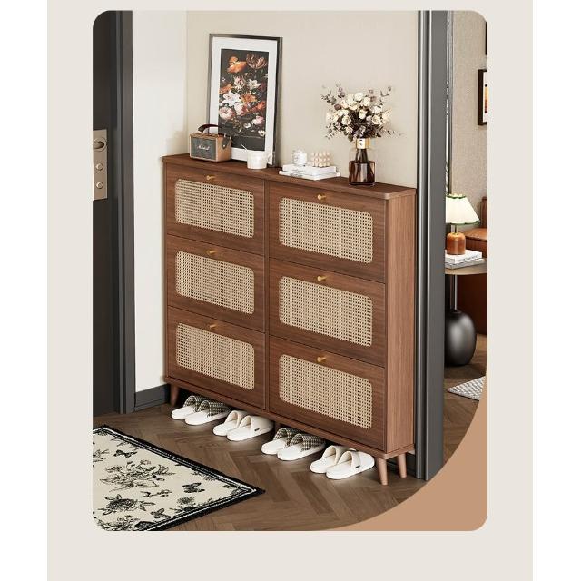 免運 超薄鞋櫃 鞋櫃 玄關鞋櫃 翻斗鞋柜藤編超薄鞋櫃家用門口2025新款中古風玄關櫃入戶胡桃色翻斗窄鞋架