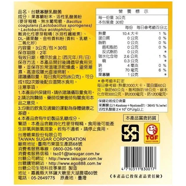 台糖益生菌 寡醣乳酸菌 衛署健食字第A00172號 促進腸道蠕動 盒裝/30包